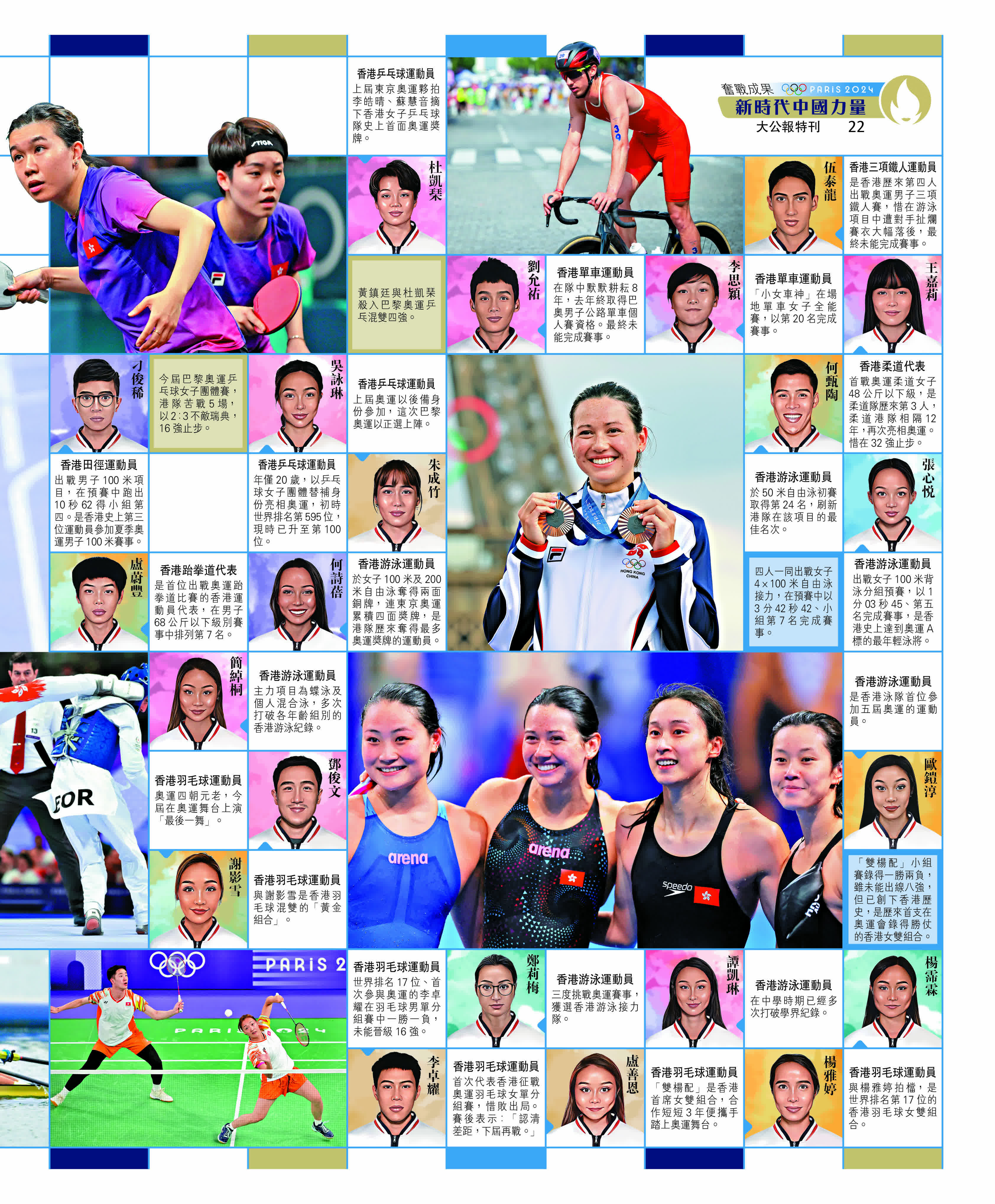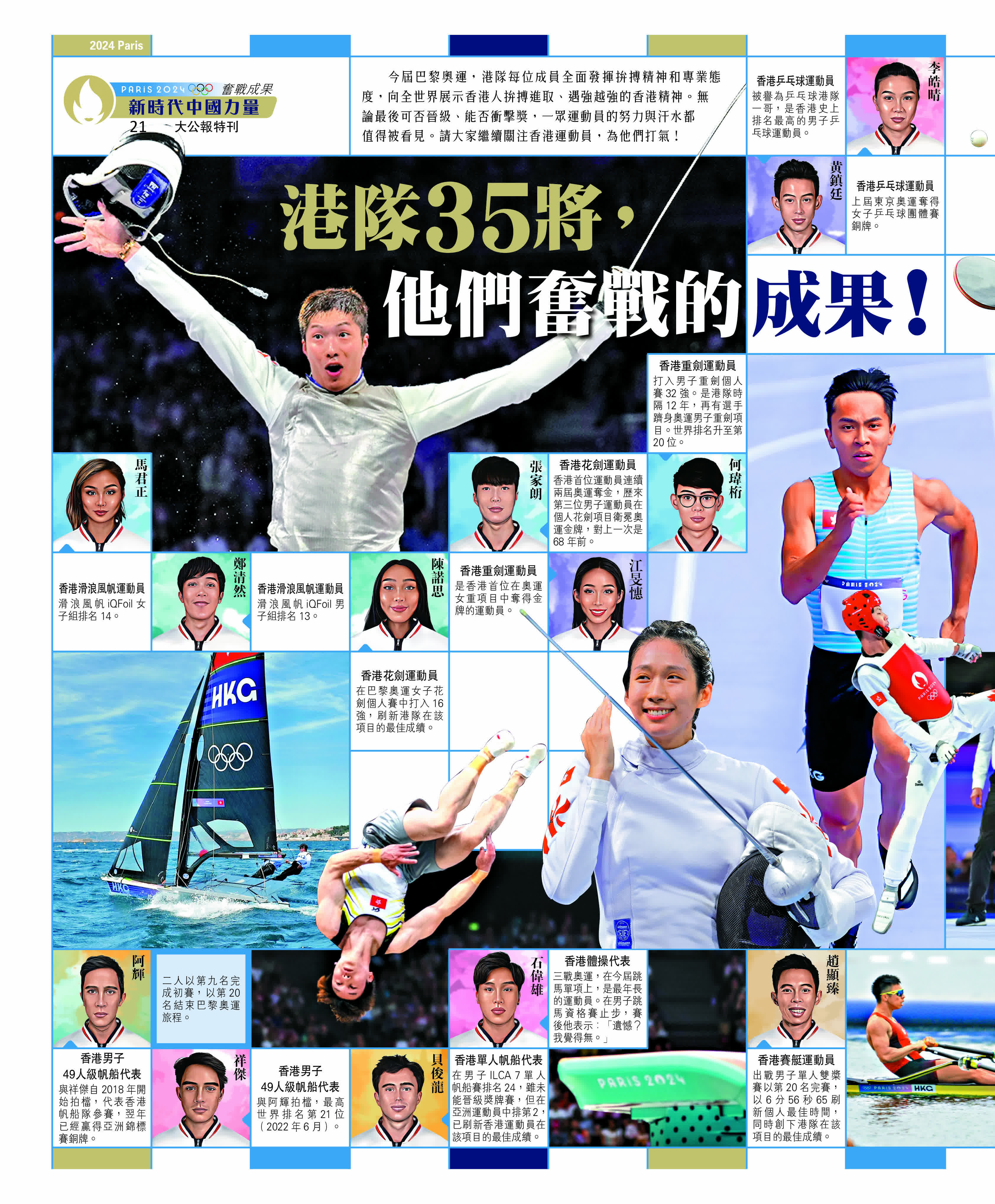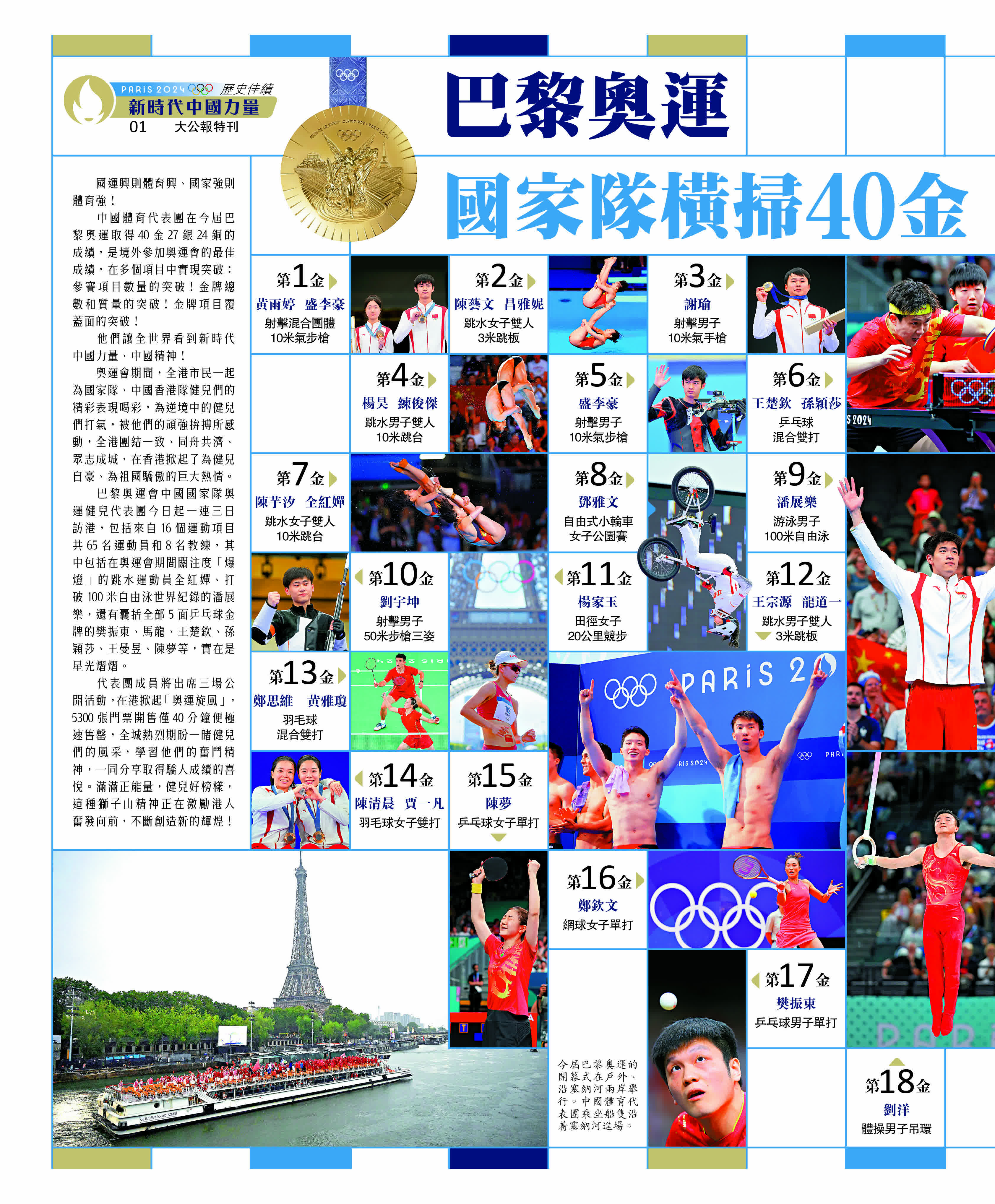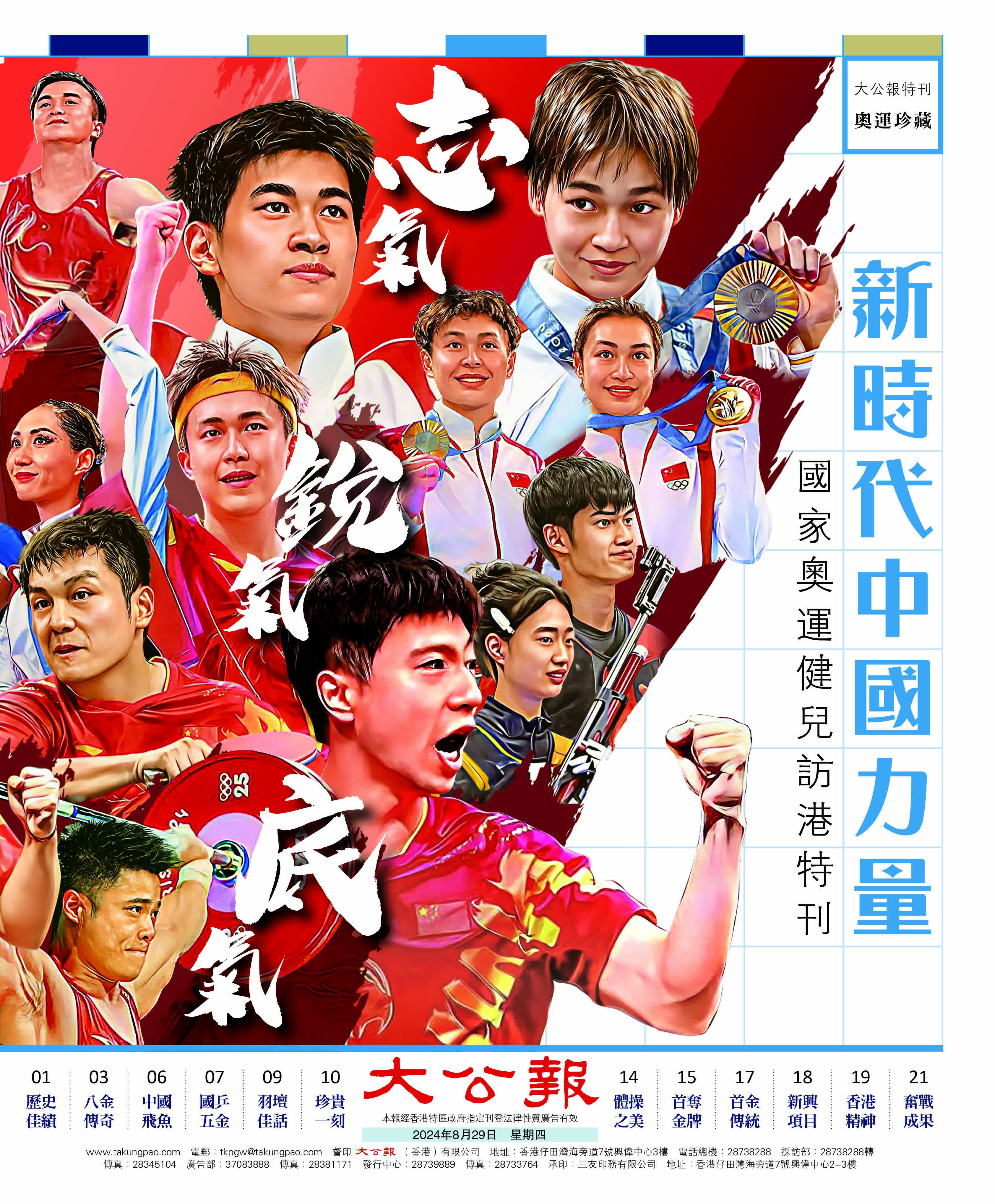 大公文匯全媒體報道,2024年巴黎奧運會內地奧運健兒代表團29日抵港,進行為期3天訪問活動。本次國家隊訪港代表團包括16個運動項目共65名運動員和8名教練,除網球女單金牌得主鄭欽文正忙於美網比賽,國家隊今屆奧運其餘39個項目的金牌運動員都會隨團訪港。《大公報》29日推出特刊《奧運珍藏》記錄巴黎奧運高燃時刻,歡迎內地奧運健兒。