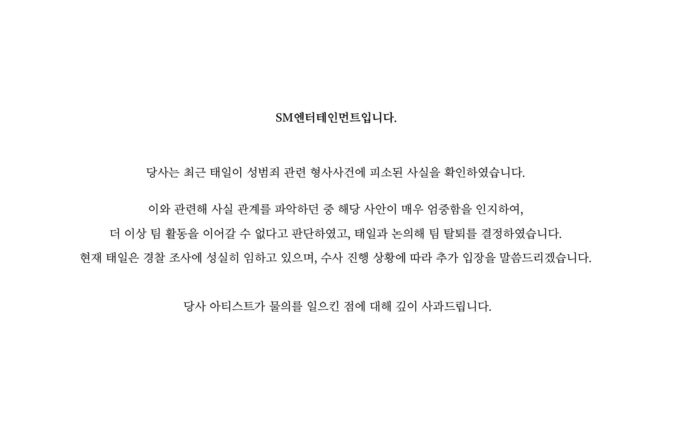 我司最近確認了泰一被起訴性犯罪相關刑事案件的事實。與此相關,在掌握事實關係的過程中,認識到該事件非常嚴重,判斷到他不能再繼續組合活動,與泰一進行討論後決定退出組合。目前,泰一正在認真配合警方調查,根據調查進展情況將做進一步表態。 對於我司藝人引發的爭議,我們深表歉意。