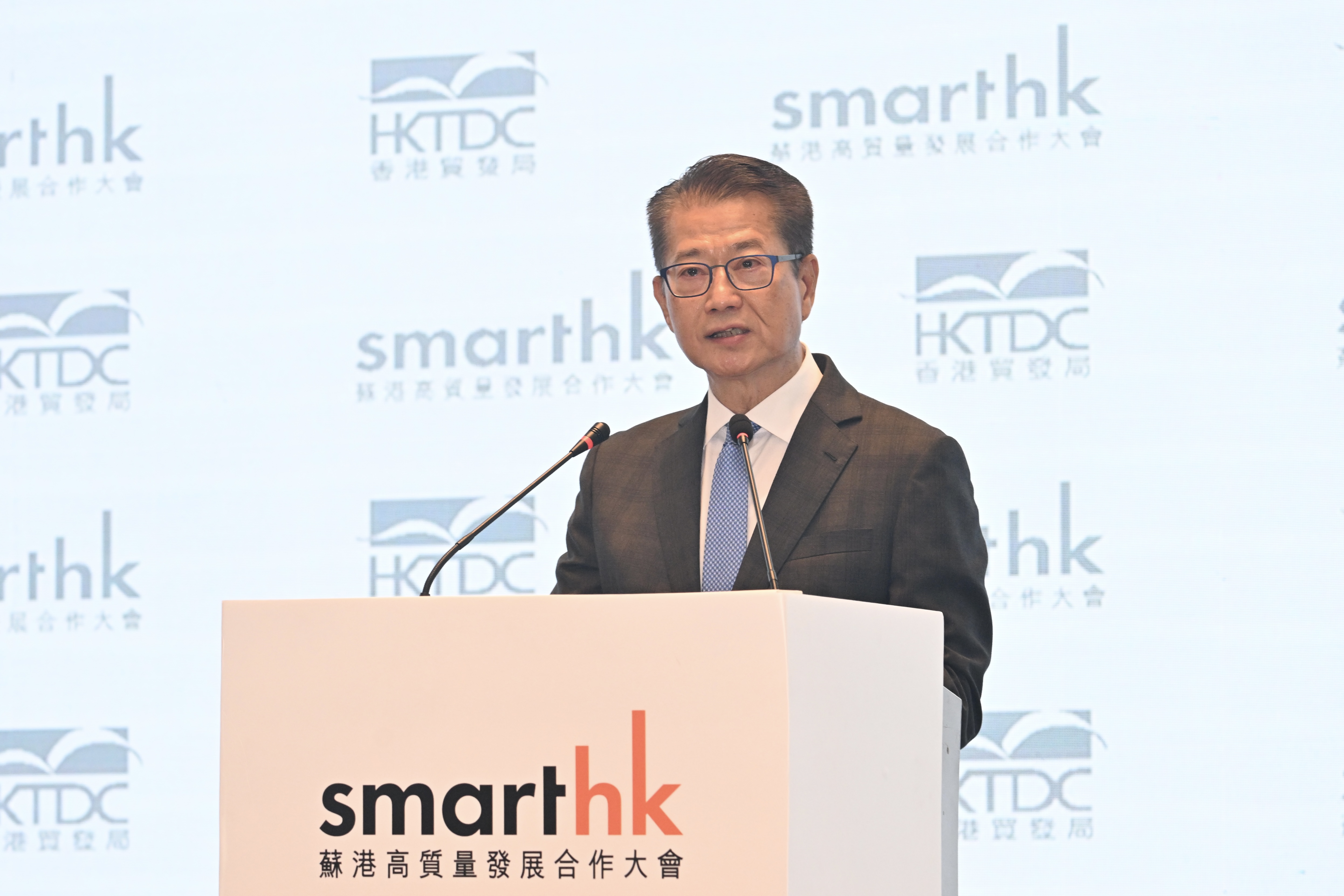 陳茂波早上出席SmartHK蘇港高質量發展合作大會,並致開幕辭。他表示,江蘇正積極擴大高水平對外開放,打造產業科技創新高地,而香港作為國際金融、貿易、航運中心,並在積極推進國際創科中心、知識產權貿易中心、中外文化藝術交流中心等建設。兩地在現時深厚的合作基礎上,可以進一步深化合作,共同為國家的高質量發展作出貢獻。展望未來,他提出用好香港優勢、加強兩地在以下四方面的互利合作:一是利用香港的國際金融市場,為江蘇企業拓展融資新渠道;二是善用香港的專業服務平台和優勢,打造跨國供應鏈管理中心;三是結合兩地科研優勢,開啓科技創新合作新篇章;四是加強文創産業合作,共同講好中國故事。