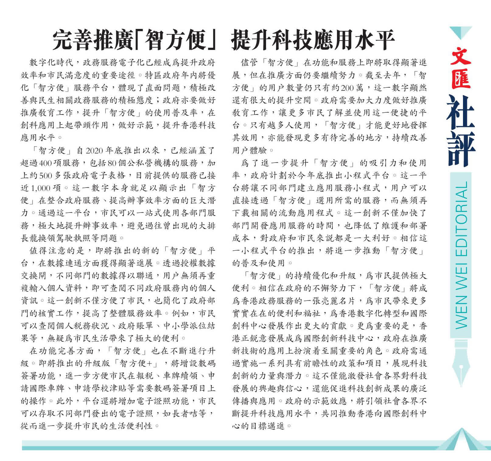 數字化時代,政務服務電子化已經成為提升政府效率和市民滿意度的重要途徑。特區政府年內將優化「智方便」服務平台,體現了直面問題,積極改善與民生相關政務服務的積極態度;政府亦要做好推廣教育工作,提升「智方便」的使用普及率,在創科應用上起帶頭作用,做好示範,提升香港科技應用水平。