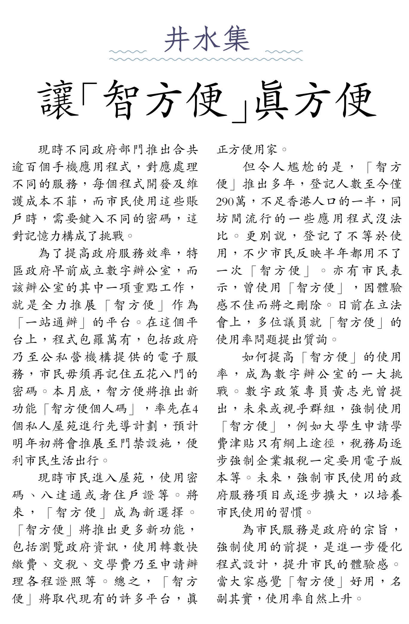 為了提高政府服務效率,特區政府早前成立數字辦公室,而該辦公室的其中一項重點工作,就是全力推展「智方便」作為「一站通辦」的平台。在這個平台上,程式包羅萬有,包括政府乃至公私營機構提供的電子服務,市民毋須再記住五花八門的密碼。本月底,智方便將推出新功能「智方便個人碼」,率先在4個私人屋苑進行先導計劃,預計明年初將會推展至門禁設施,便利市民生活出行。