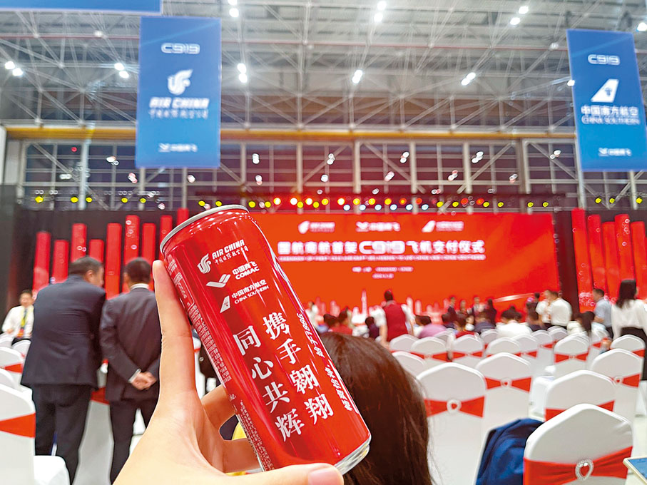 「哎呀,這飛機可以的,好舒服!」「當然,這個飛機特別棒!」隨着兩架飛機的亮相,現場嘉賓爭先恐後登機參觀。國航首架C919因為是首架「身披」國旗的C919,吸引了不少人在進入機艙前與機身上的國旗合影留念。香港文匯報記者剛踏入機艙,便聽到前序參觀者一臉笑意地對國產大飛機大加讚美,機上的乘務人員也是自豪地回應,並邀請參觀者入座感受國產大飛機的寬敞乘坐空間,介紹機上的特色設計。