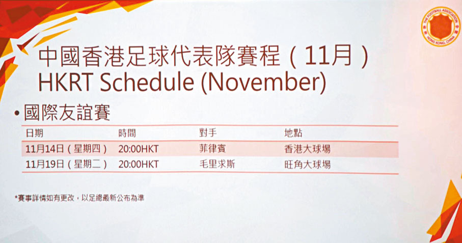 另外,會上足總公布了未來數個月的賽程安排,包括9月的斐濟三角賽。賽事已安排直播,讓在香港的球迷能夠透過電視收看比賽。在10月和11月,港隊會有3場主場比賽及1場作客比賽,包括主場迎戰柬埔寨、菲律賓、毛里求斯,以及作客列支敦士登,而在12月亦會在港舉行東亞足球錦標賽外圍賽。