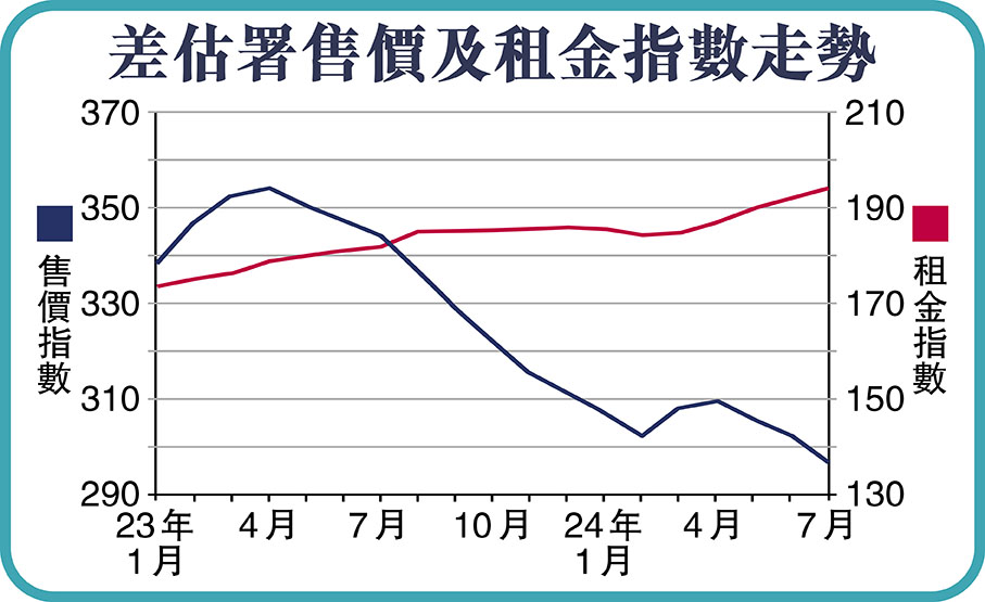 相反,租金指數維持升勢,連升5個月,7月報194.1點,較6月升1.09%。各戶型單位租金亦全線上升,值得留意是,售價跌幅最大的C類單位同時成為租金升幅最大的類別,最新報164.5點,按月升1.73%。其他類別方面,A類單位租金指數報215.2點,升1.32%;B類單位報193.5點,升0.89%;D類單位報154.3點,升1.05%;E類單位報142.2點,升1.5%。