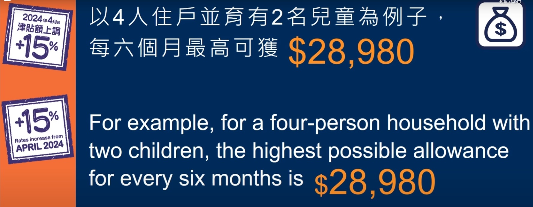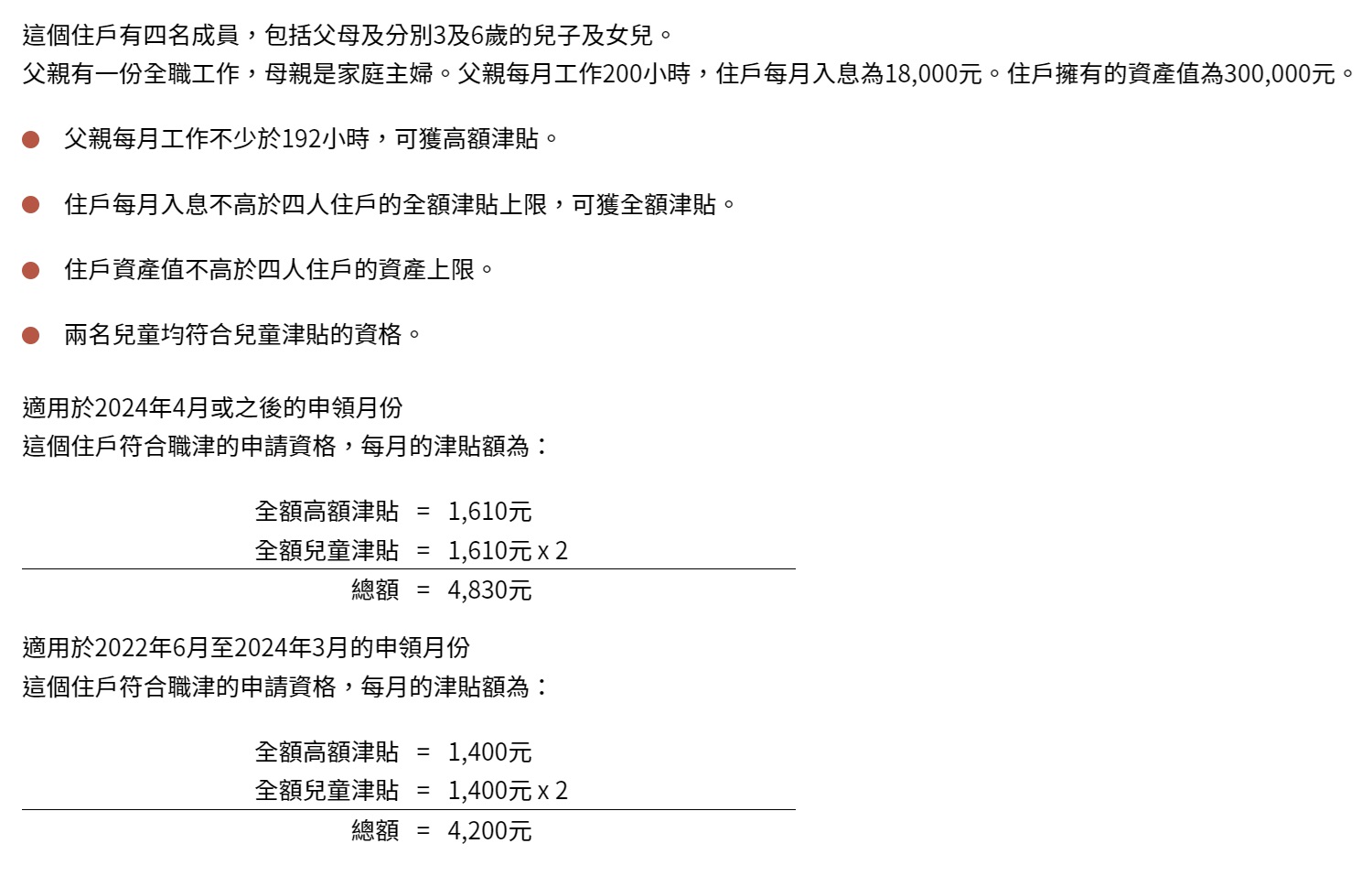 以一個四口之家為例,父親全職工作,母親是家庭主婦,父親每月工作200小時,住戶每月入息18000元,擁有資產值為300000元,適用於2024年4月或之後的申領月份,這個住戶每月可以拿到4830元的津貼。