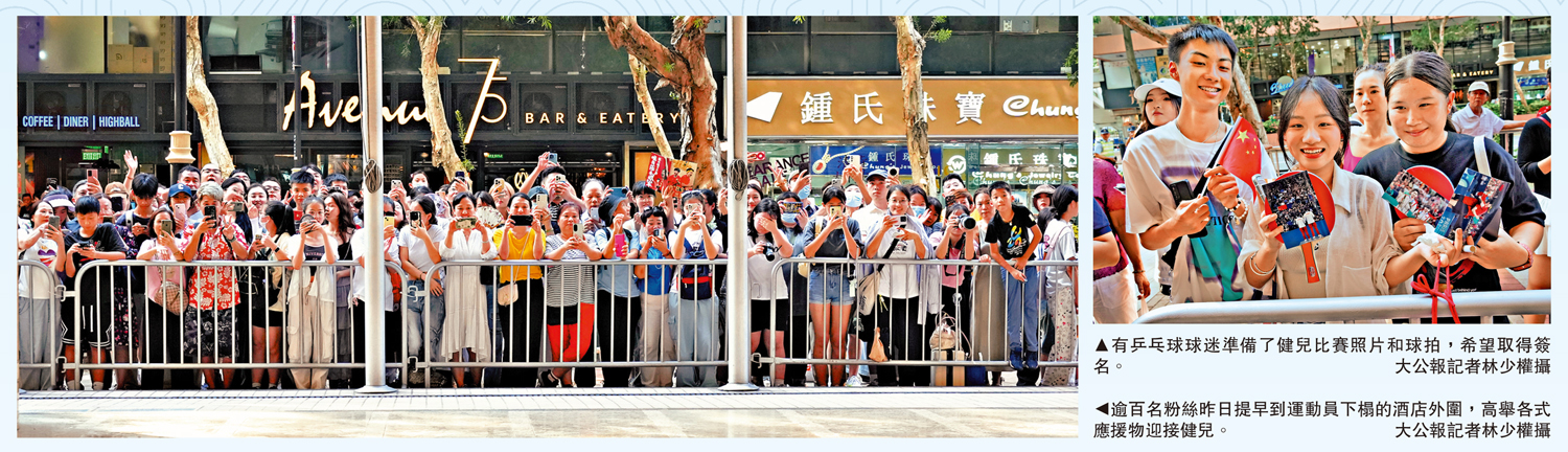 不少粉絲特為見健兒一面而遠道而來。江西旅客吳小姐向大公報記者說,昨日早上乘坐高鐵抵港,一下車便馬不停蹄地帶着「馬龍」字樣的橫幅及巨大的玩偶熊直奔酒店,在現場等候逾一小時。她說,「健兒們這次來港恰逢工作日,了解到行程後就和朋友一起請了假,馬上訂大清早的高鐵來香港,就是為了見他們一面。」她希望在運動員訪港期間,有機會向馬龍贈送玩偶熊,「馬龍為國爭光好樣的,希望他身體健康,只要他繼續征戰球場,我們所有球迷都會到場加油。」