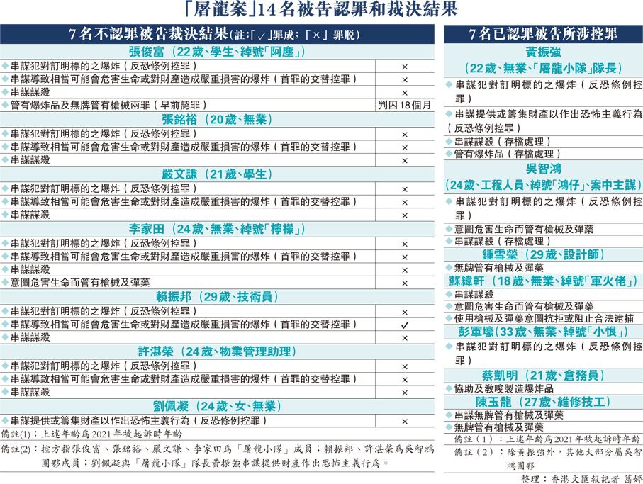 (香港文匯報記者 葛婷)黑暴極端組織「屠龍小隊」與其他激進團夥策劃於2019年12月8日藉「民陣」遊行,在灣仔製造連環爆炸及槍擊警員案,涉案14名被告中10人被律政司首次引用《聯合國(反恐怖主義措施)條例》提告,當中7人已承認多項不同罪名,涉及罪名最高可判終身監禁;而餘下7人受審後,3男6女陪審團昨裁定第五被告賴振邦其中一項屬交替控罪的「串謀導致相當可能會危害生命或對財產造成嚴重損害的爆炸罪」罪成,其餘6人所涉控罪全部罪脫,但首被告張俊富早前另承認「管有爆炸品」等兩罪,即日判囚18個月。對於陪審團昨日的裁定結果,警方國家安全處總警司李桂華表示不作評論,但強調有關案件性質非常嚴重。