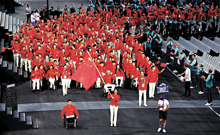 巴黎殘奧會中國體育代表團,在女子輪椅劍擊運動員辜海燕,以及男子舉重運動員齊勇凱兩位旗手的引領下入場。代表團共有運動員284人,平均年齡25.8歲,年齡最大的是48歲的乒乓球運動員熊桂豔,年齡最小的是15歲的游泳運動員朱慧。代表團將參加巴黎殘奧會射箭、田徑、羽毛球、硬地滾球等19個大項、302個小項的角逐。