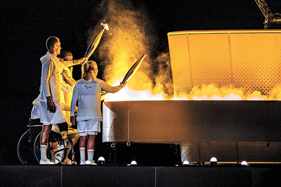 現場隨後播放了巴黎殘奧會火炬傳遞的短片。二戰期間,為激勵受傷的官兵積極恢復,「殘疾人體育之父」路古特曼組織他們積極進行體育運動,由此慢慢形成了被廣泛認為是殘奧運動前身的斯托克曼德維爾運動會。8月24日,巴黎殘奧會聖火在英國斯托克曼德維爾採集,抵達法國後由1,000名火炬手在法國本土傳遞。