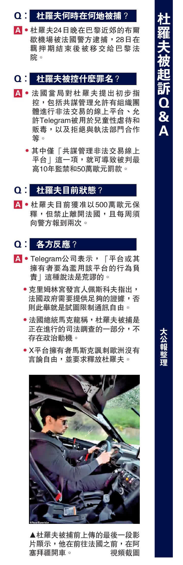 大公報報道,巴黎檢察官貝屈奧在一份新聞公報中表示,杜羅夫已於28日晚被起訴,他在司法監控下獲得保釋,但須繳納500萬歐元的保證金、每周兩次到警察局報到以及被禁止離開法國領土。