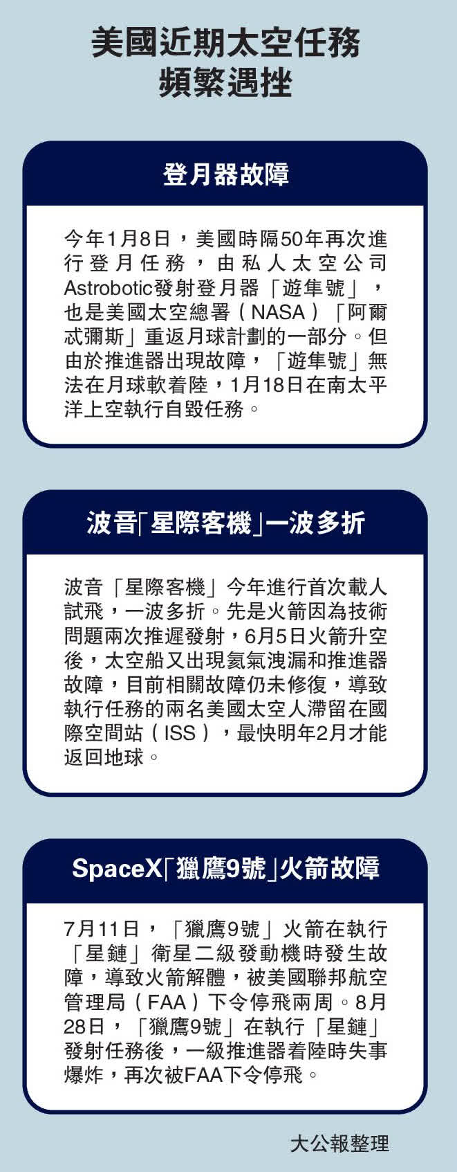 停飛令亦影響NASA的部署。NASA日前宣布,將在9月底發射「獵鷹9號」火箭搭載「龍」飛船,送兩名太空人到國際空間站(ISS),並於明年2月用「龍」飛船搭載受困於ISS多月的2名美國太空人威廉姆斯和威爾莫爾返回地球。分析指,如今「獵鷹9號」火箭被禁飛,恐將導致威廉姆斯和威爾莫爾的返程面臨再被推遲的風險。