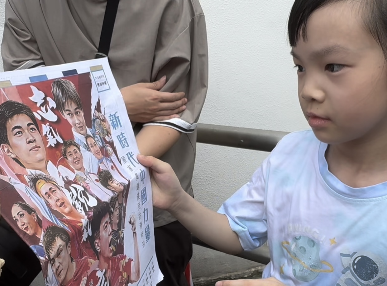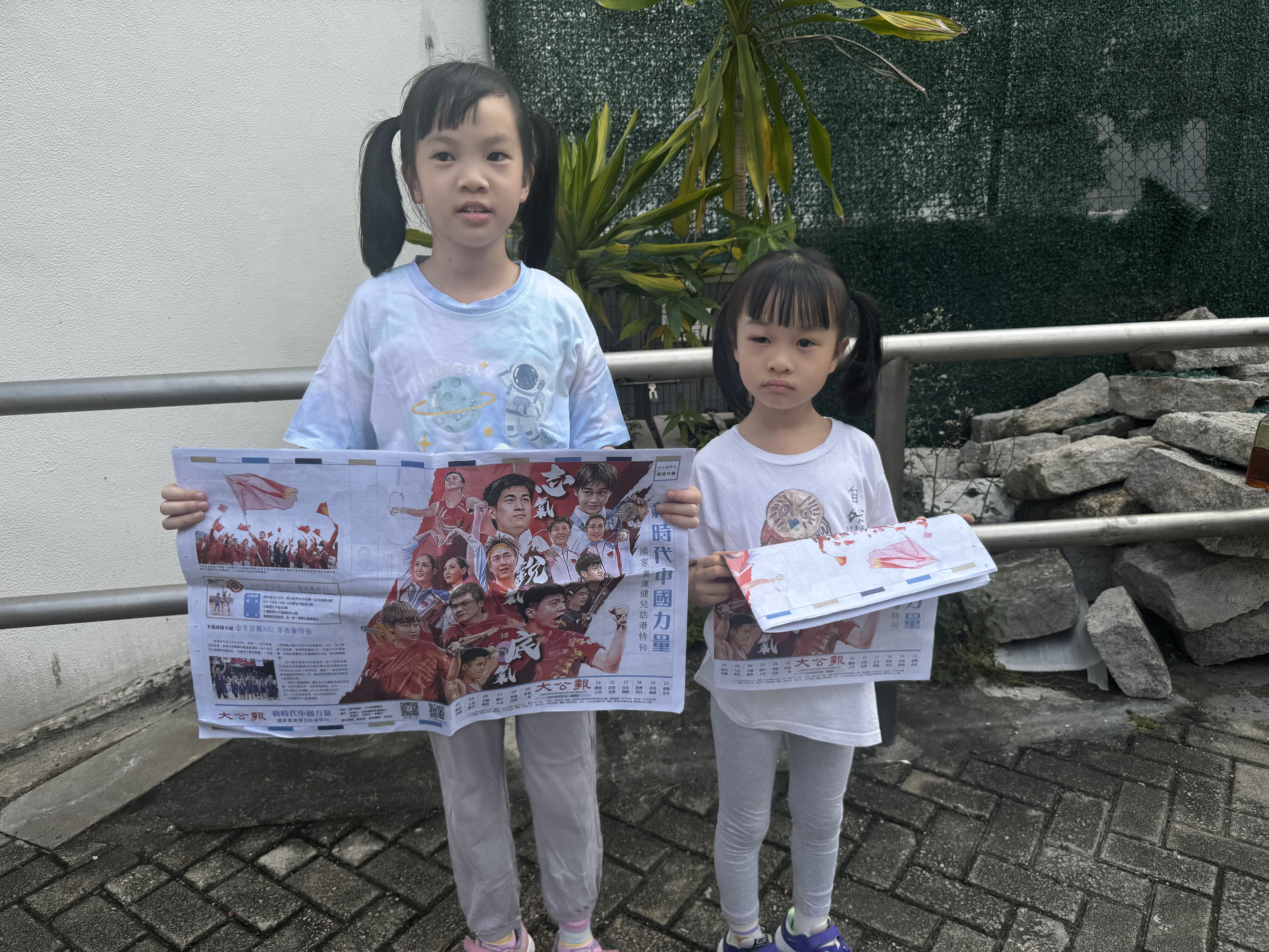 即將升小學五年級的Angela住在聖保羅書院附近。早晨聽到有車輛和警察的聲音,知道是運動員來了,馬上和同樣喜歡奧運健兒的媽媽飛奔趕至。在樓下看到《大公報》推出的奧運特刊,上面有很多自己認識的運動員,於是就和妹妹一人拿了一份。