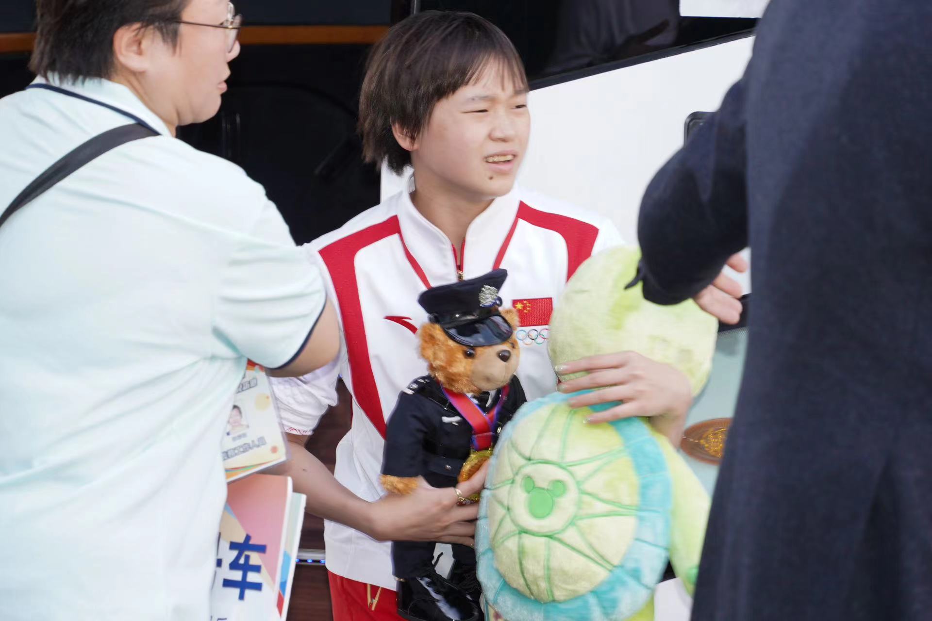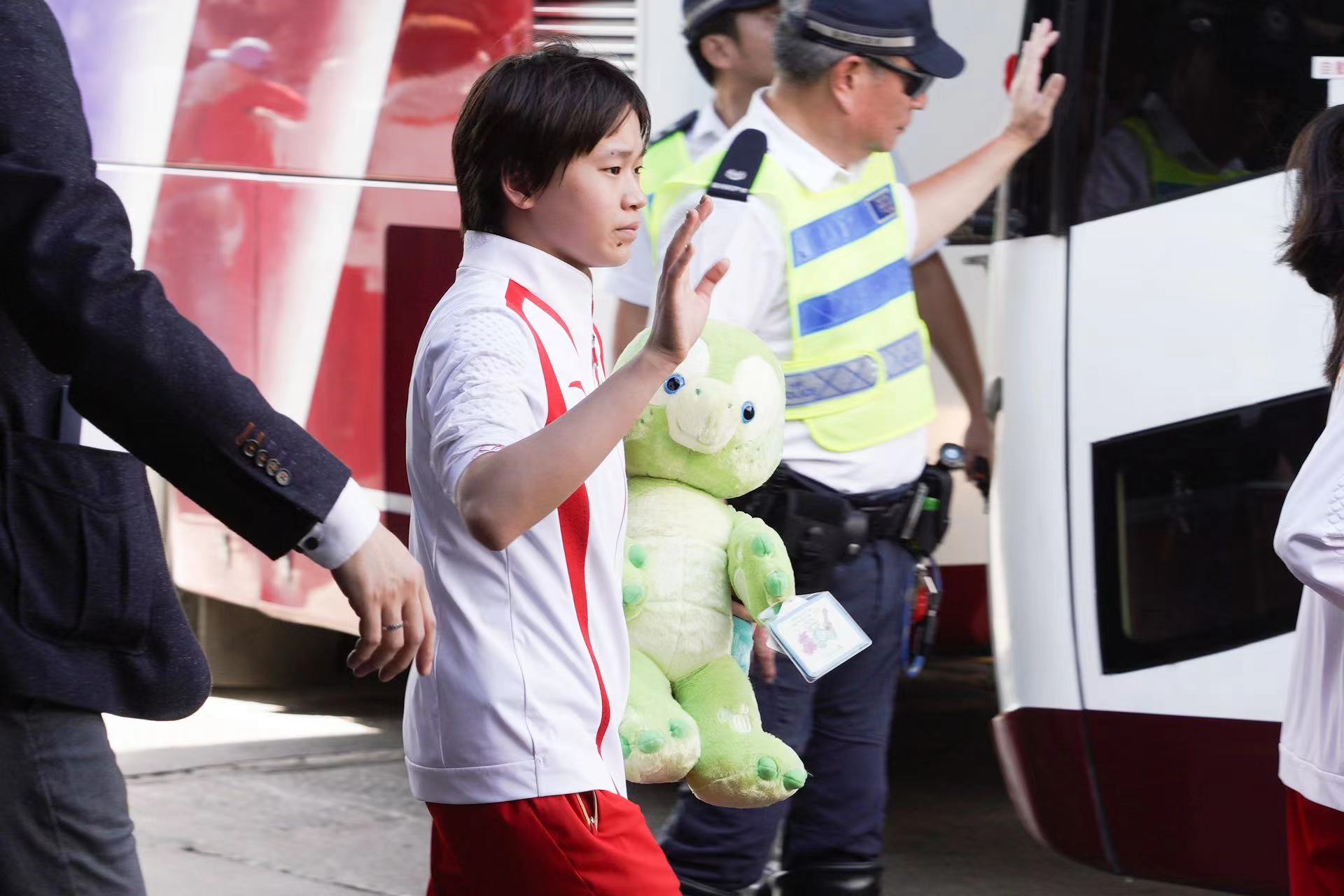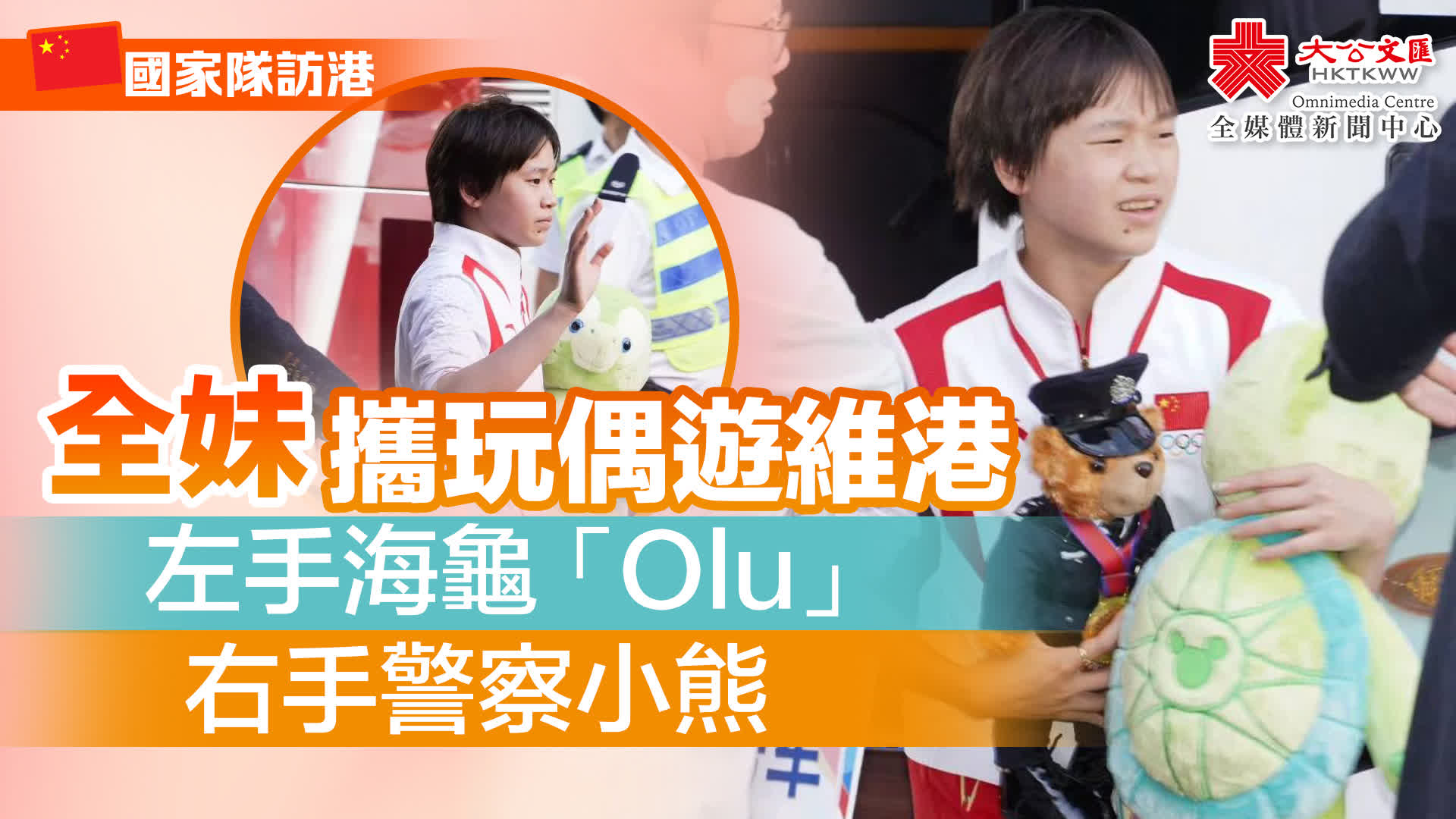 代表團訪港引得全民喝采,今天(30日)下午代表團乘船遊覽維港。鐘愛烏龜玩具的全妹更喜獲新玩偶,抵達尖沙咀碼頭下船時,全妹一手抱着迪士尼小海龜「Olu」、一手抱着警察小熊,同市民開心打招呼。