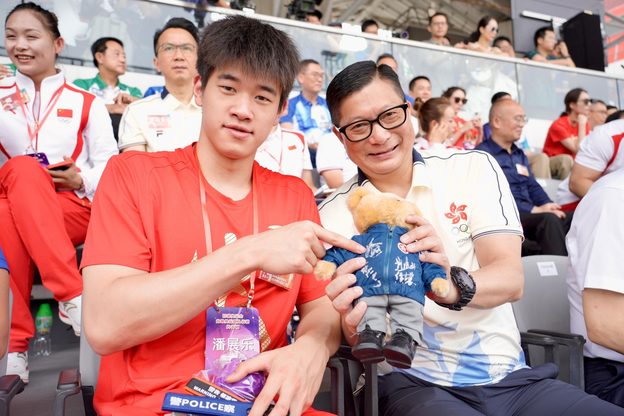 保安局局長鄧炳強在社交平台發文指,見到包括破世界紀錄的泳手潘展樂、舉重運動員李雯雯、乒乓男單金牌樊振東,以及乒乓球名將馬龍等國家運動員,大家都非常興奮。