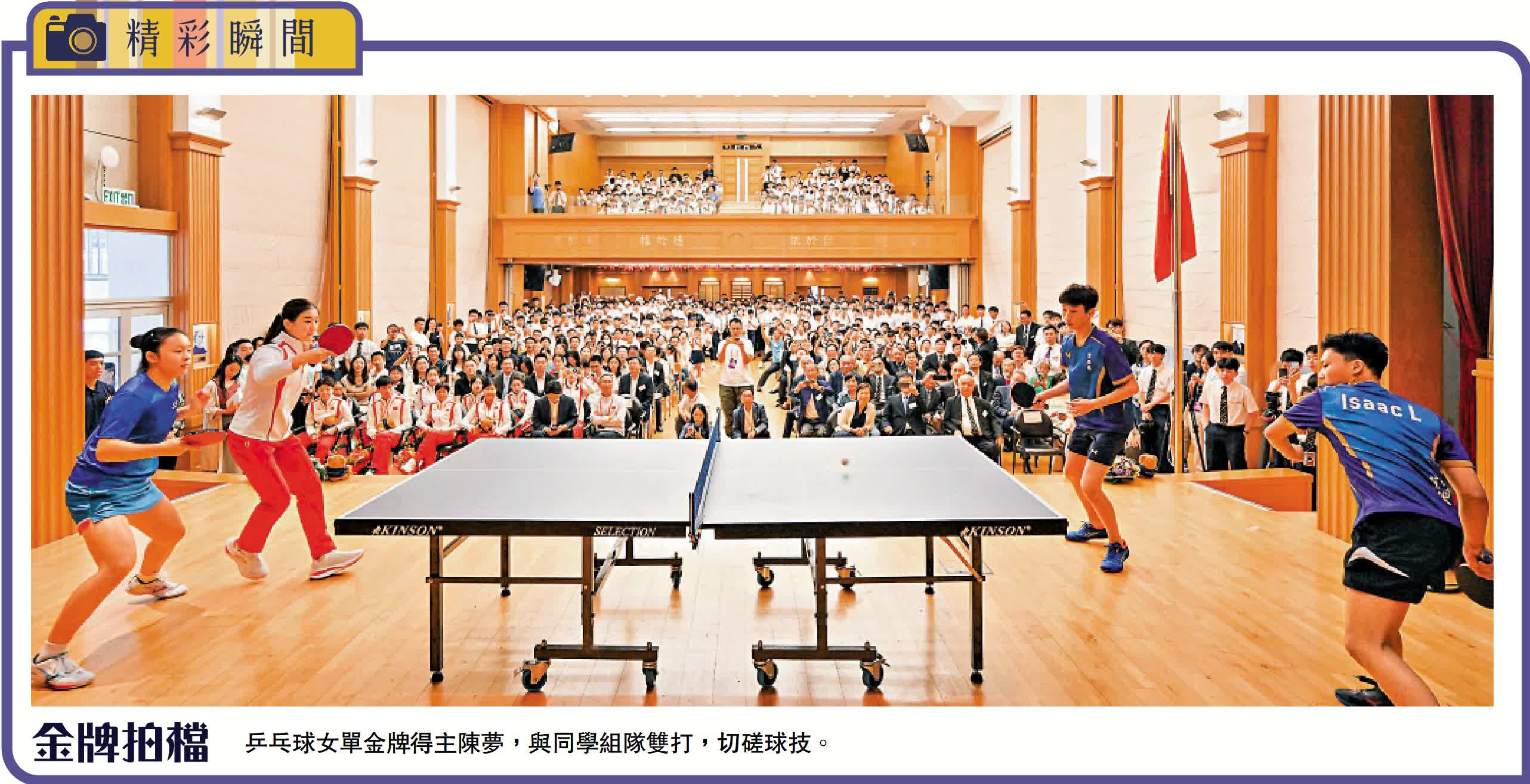 此外,射擊金牌得主盛李豪也成為陳夢的「徒弟」,與其他學生進行乒乓球的切磋。經過陳夢簡單調整後,他在與香港女學生代表的對戰中輕鬆得分,令在場觀眾及陳夢不禁拍掌歡呼。二人學得有模有樣,全紅嬋熟練地以反手接球;盛李豪接球時加速發力,漂亮地得分。