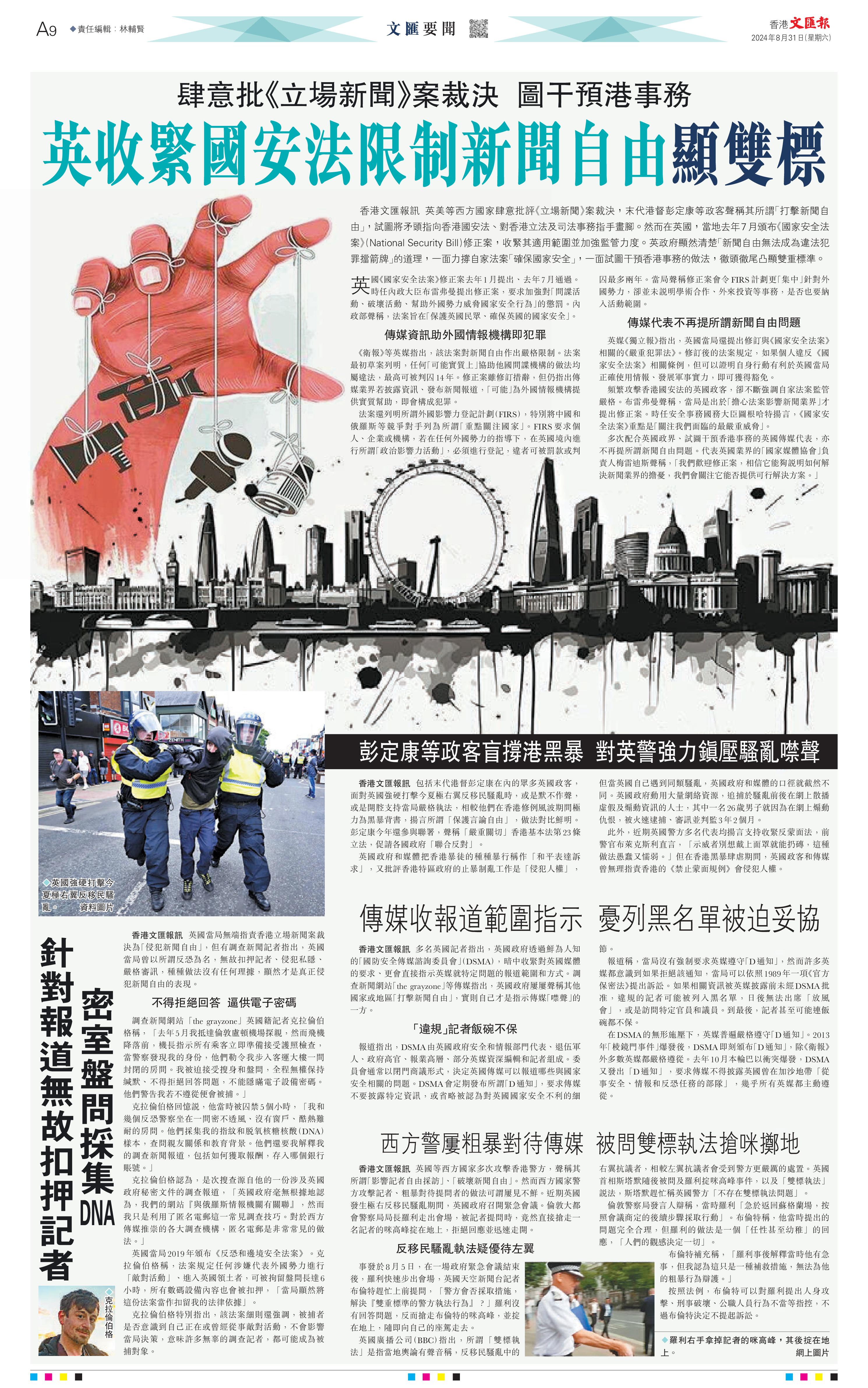 香港文匯報報道,英美等西方國家肆意批評《立場新聞》案裁決,末代港督彭定康等政客聲稱其所謂「打擊新聞自由」,試圖將矛頭指向香港國安法、對香港立法及司法事務指手畫腳。然而在英國,當地去年7月頒布《國家安全法案》(National Security Bill)修正案,收緊其適用範圍並加強監管力度。英政府顯然清楚「新聞自由無法成為違法犯罪擋箭牌」的道理,一面力撐自家法案「確保國家安全」,一面試圖干預香港事務的做法,徹頭徹尾凸顯雙重標準。