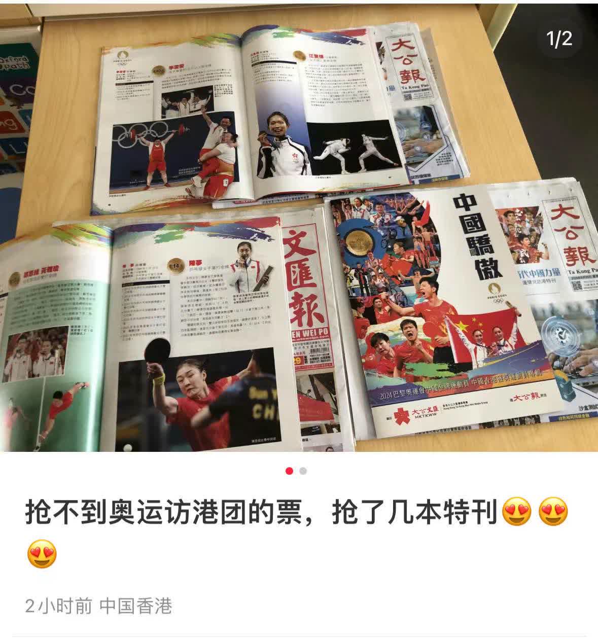 大公報30日推出特刊《奧運珍藏》記錄巴黎奧運高燃時刻,歡迎內地奧運健兒;隨報附贈一本中國金牌運動員和中國香港獲獎運動員專輯《中國驕傲》;香港文匯報推出贈閱報連海報。一經推出,便大受香港市民歡迎,很多市民表示「根本搶不到」。