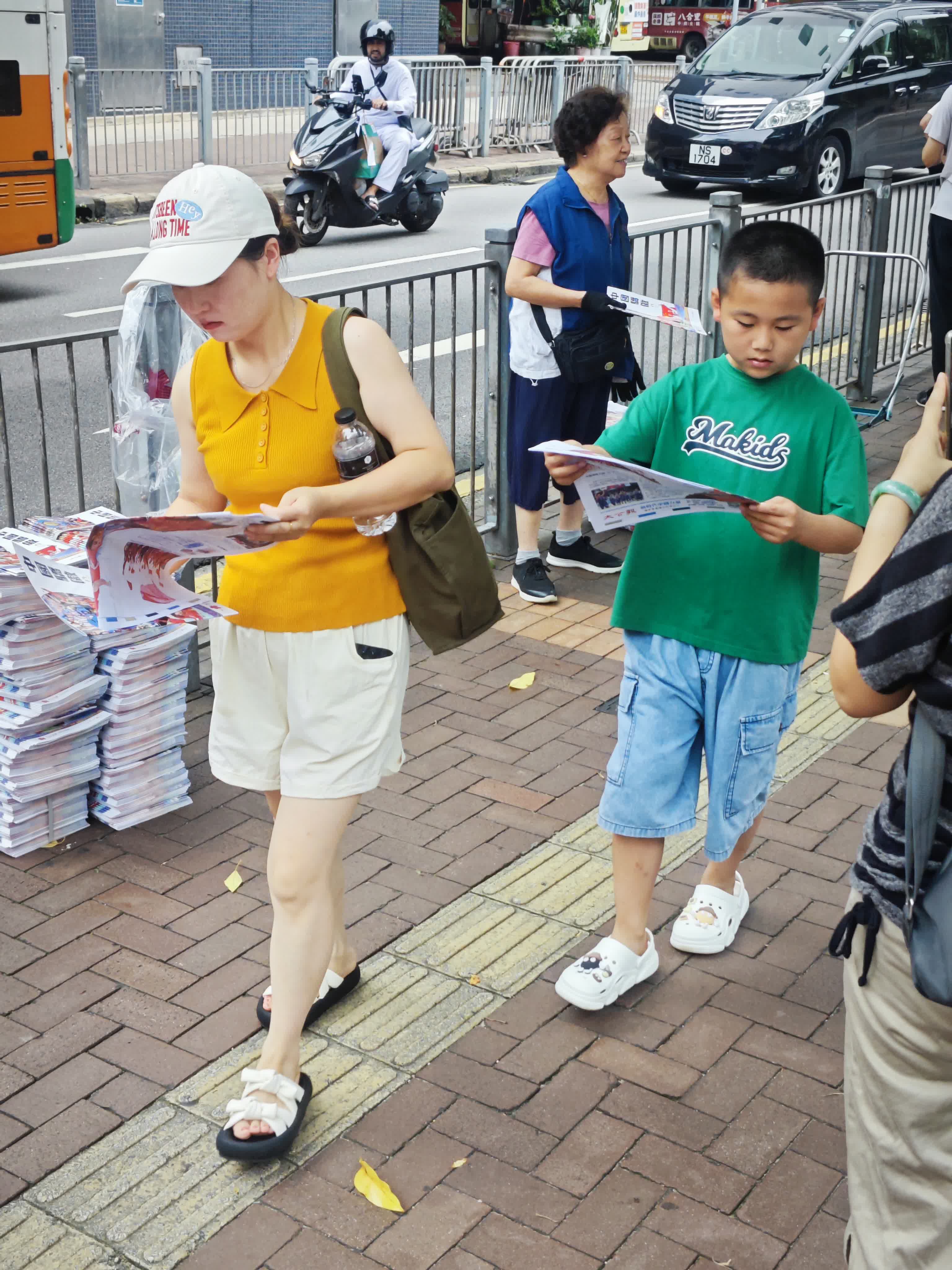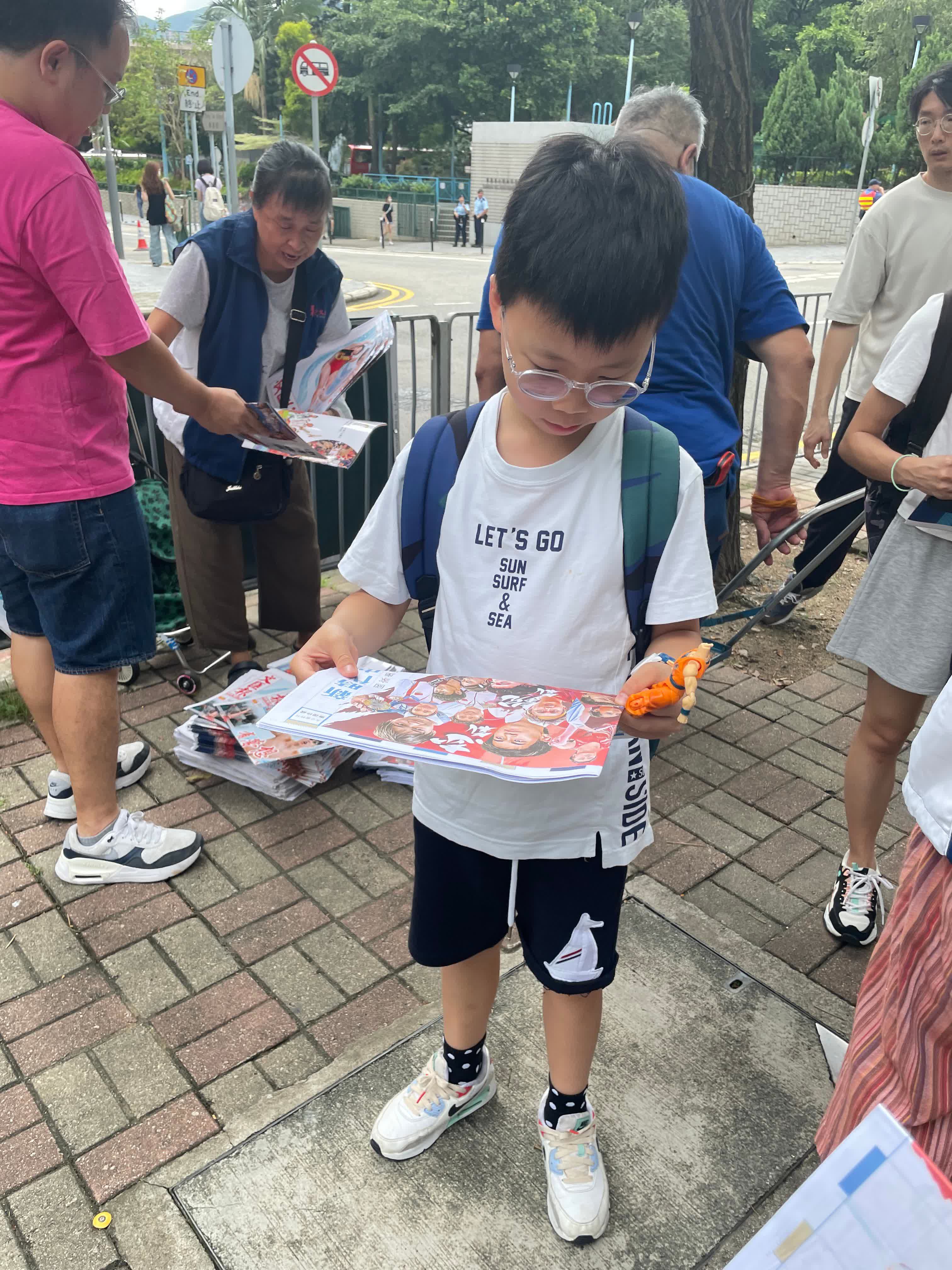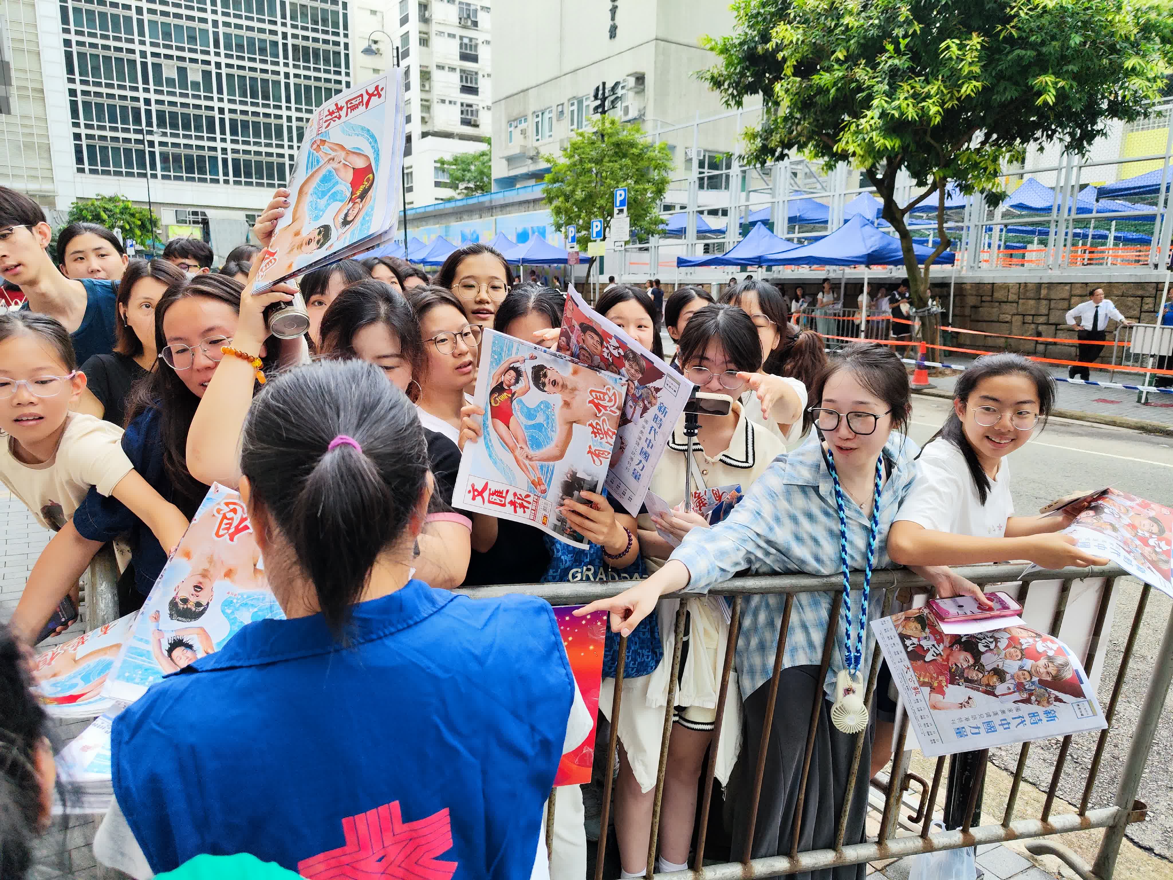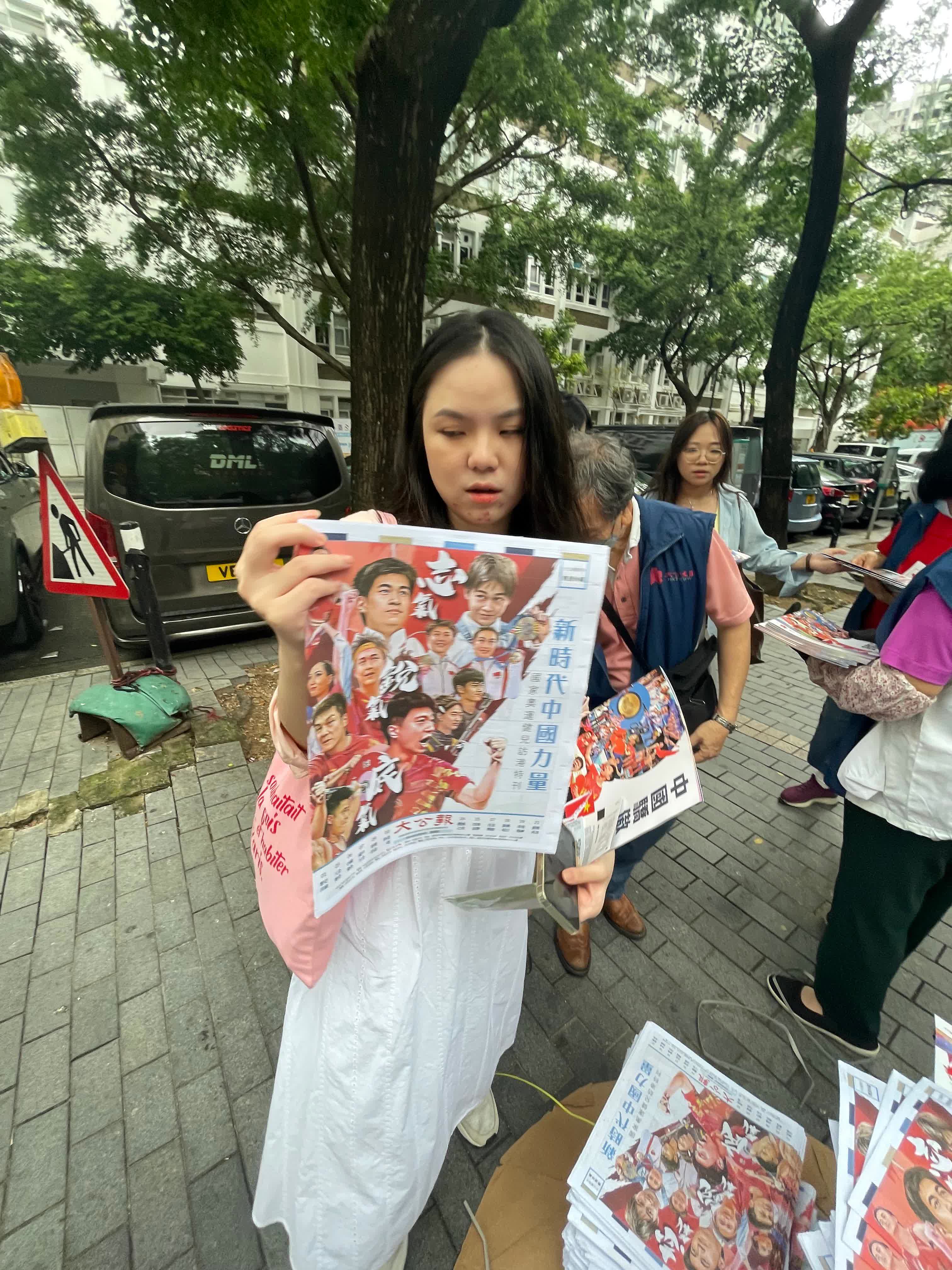 維園泳池場外,大公文匯傳媒集團向持票準備入場觀看示範表演的市民派發特刊,1000本《中國驕傲》特刊、1000份大公報《奧運珍藏》特刊、1500份文匯報贈閱報連海報,全部搶空。