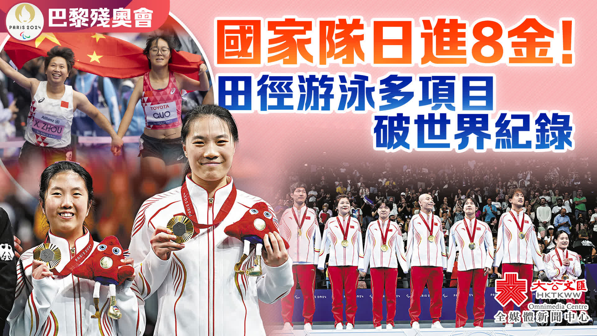 香港文匯報援引新華社報道,30日巴黎殘奧會進入第二個比賽日,中國選手在田徑、乒乓球、游泳等項目上捷報頻傳,不僅有8面金牌入賬,還多次打破世界紀錄。
