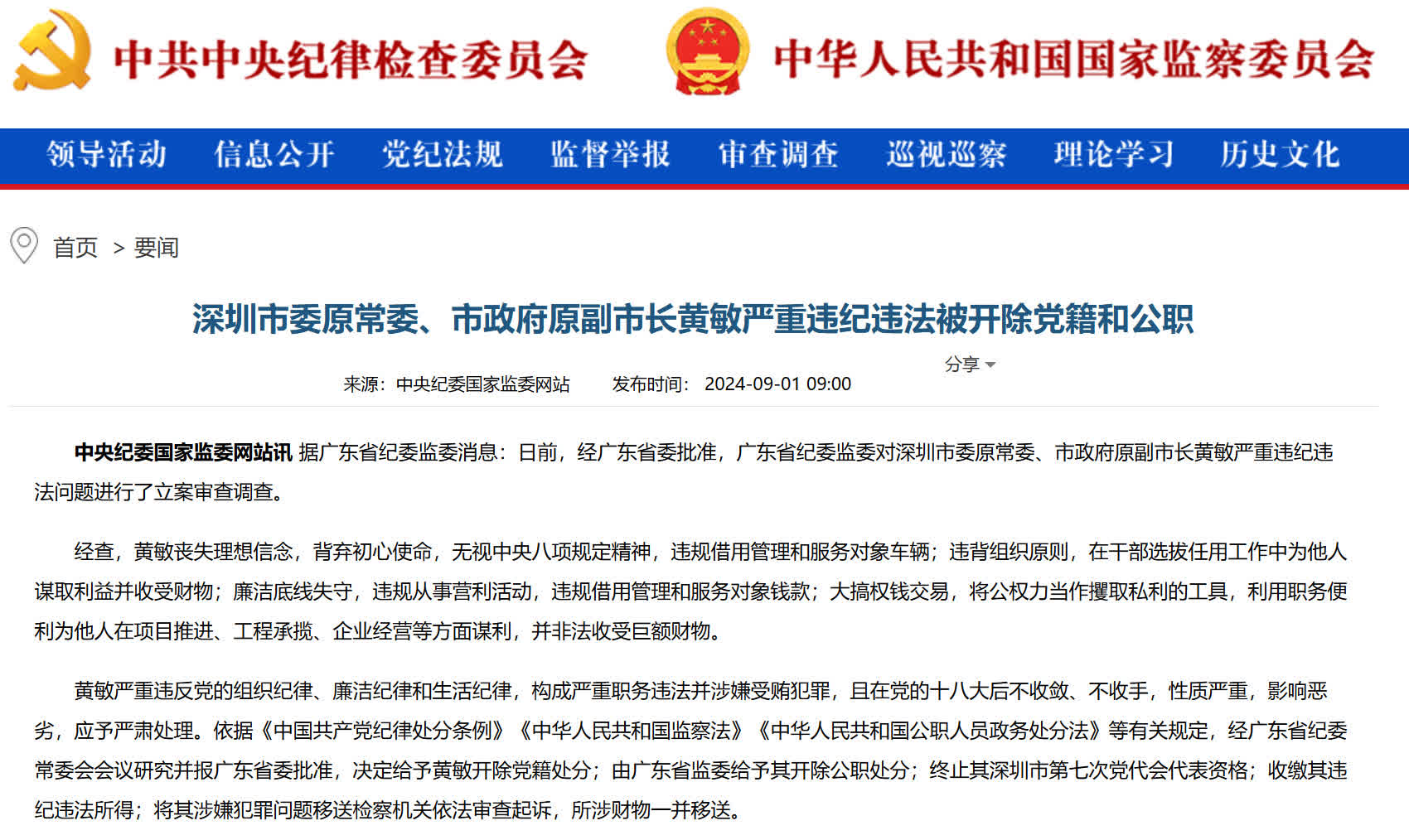 據中央紀委國家監委網站9月1日通報廣東省紀委監委消息,日前,經廣東省委批准,廣東省紀委監委對深圳市委原常委、市政府原副市長黃敏嚴重違紀違法問題進行了立案審查調查。