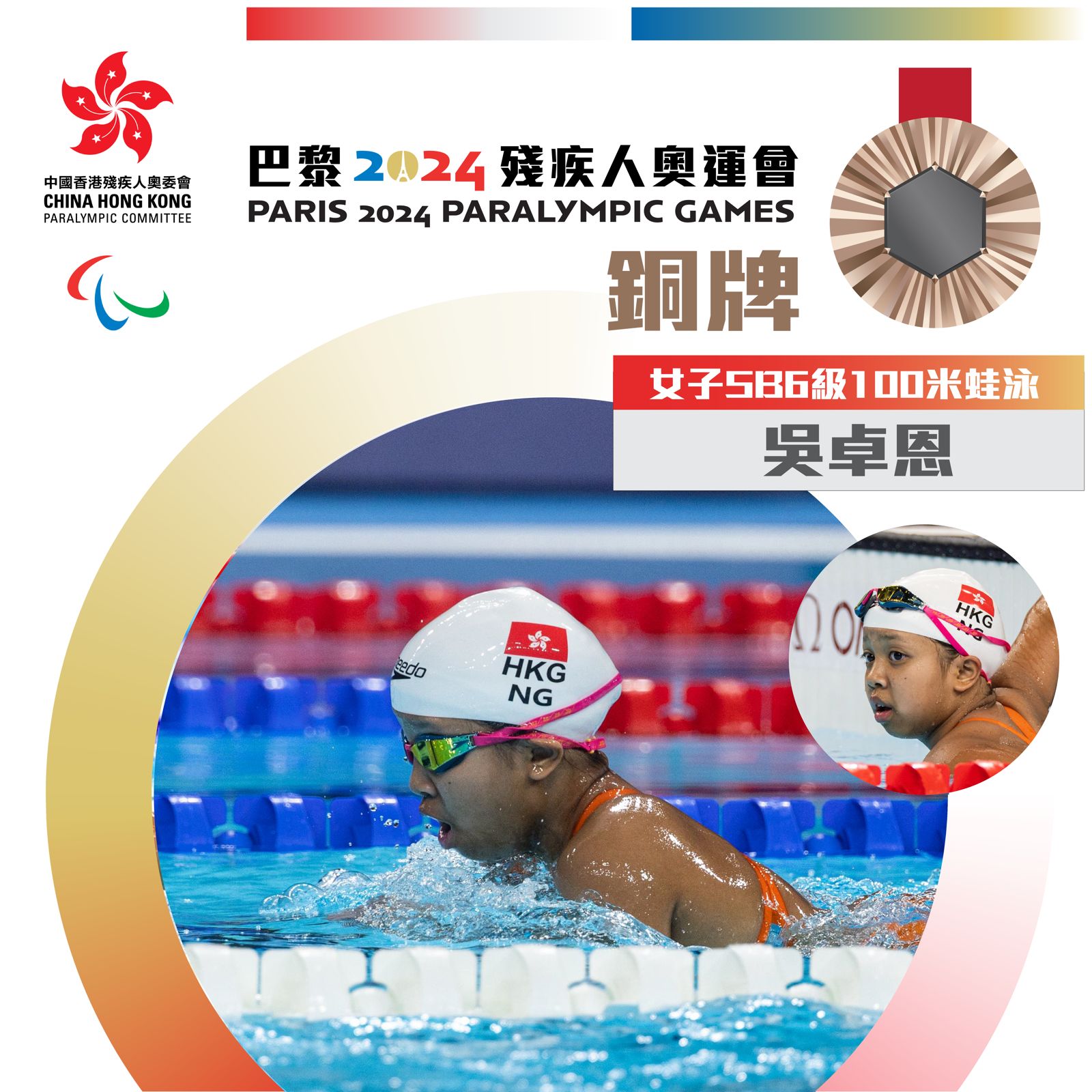 大公文匯全媒體報道,中國香港游泳運動員吳卓恩9月1日在2024年巴黎殘疾人奧運會女子SB6級100米蛙泳賽事中勇奪銅牌,為中國香港贏得今屆殘奧會第二面獎牌。行政長官李家超對吳卓恩和她的教練致以衷心祝賀。