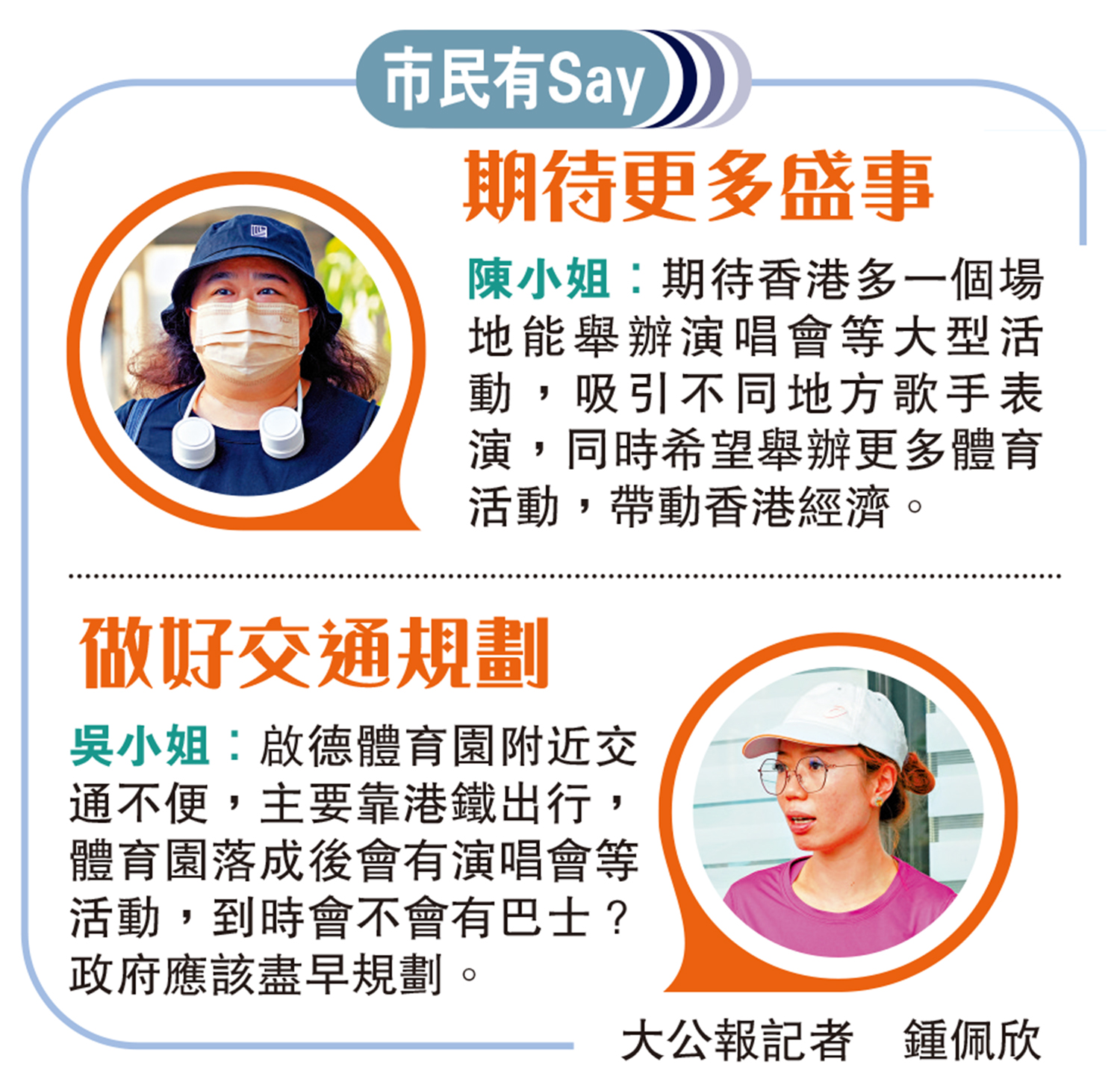 行政長官李家超日前到啟德體育園視察,了解工程落成進度,他要求工作小組確保啟德體育園順利如期落成啟用,以鞏固香港作為盛事之都的策略定位。他又預告,體育園明年第一季會舉辦大型的開幕活動,期望體育園能在推動體育發展的同時,帶動演出、旅遊等產業的發展,創造強大的經濟效益。