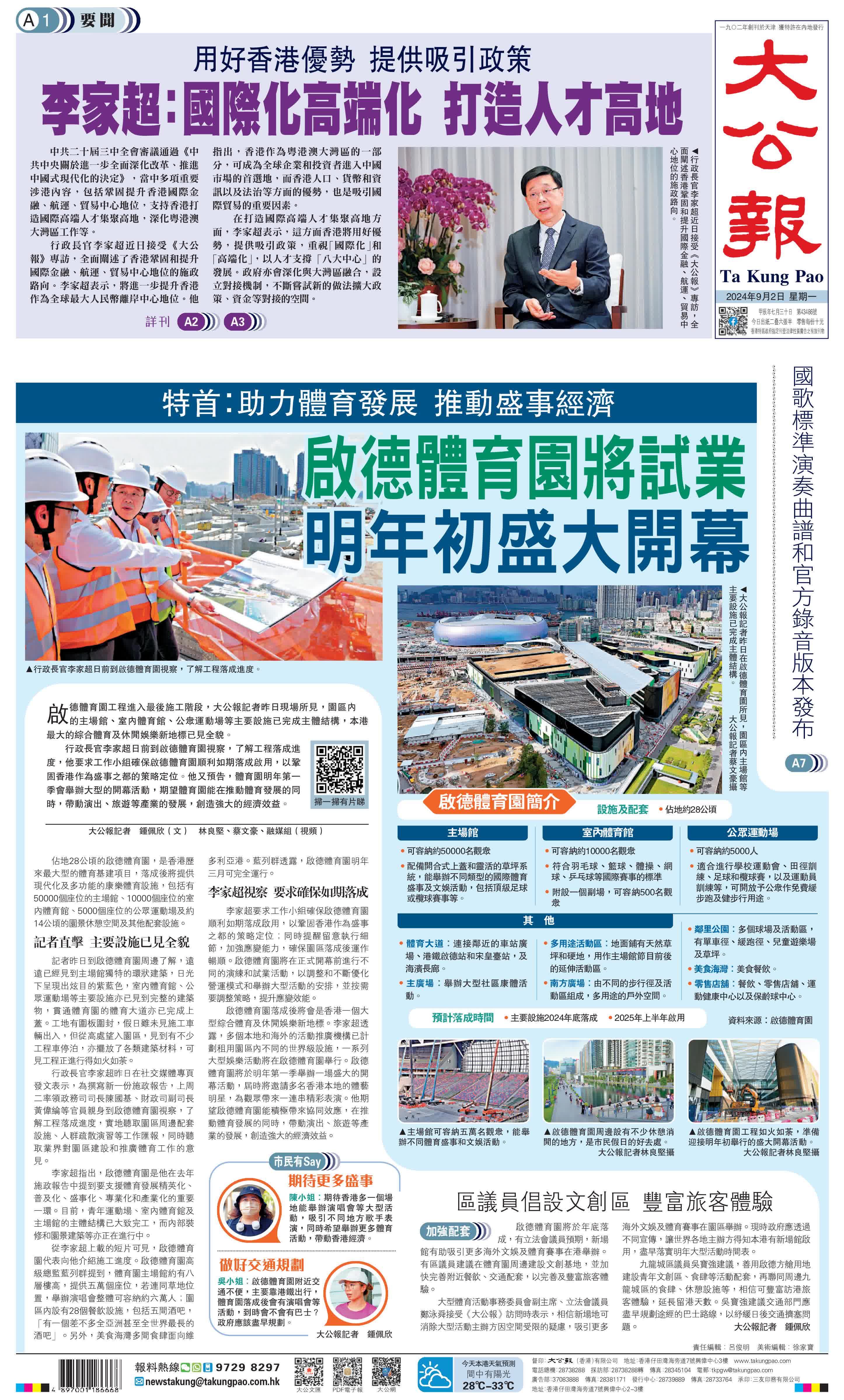 行政長官李家超昨日在社交媒體專頁發文表示,為撰寫新一份施政報告,上周二率領政務司司長陳國基、財政司副司長黃偉綸等官員親身到啟德體育園視察,了解工程落成進度,實地聽取園區周邊配套設施、人群疏散演習等工作匯報,同時聽取業界對園區建設和推廣體育工作的意見。
