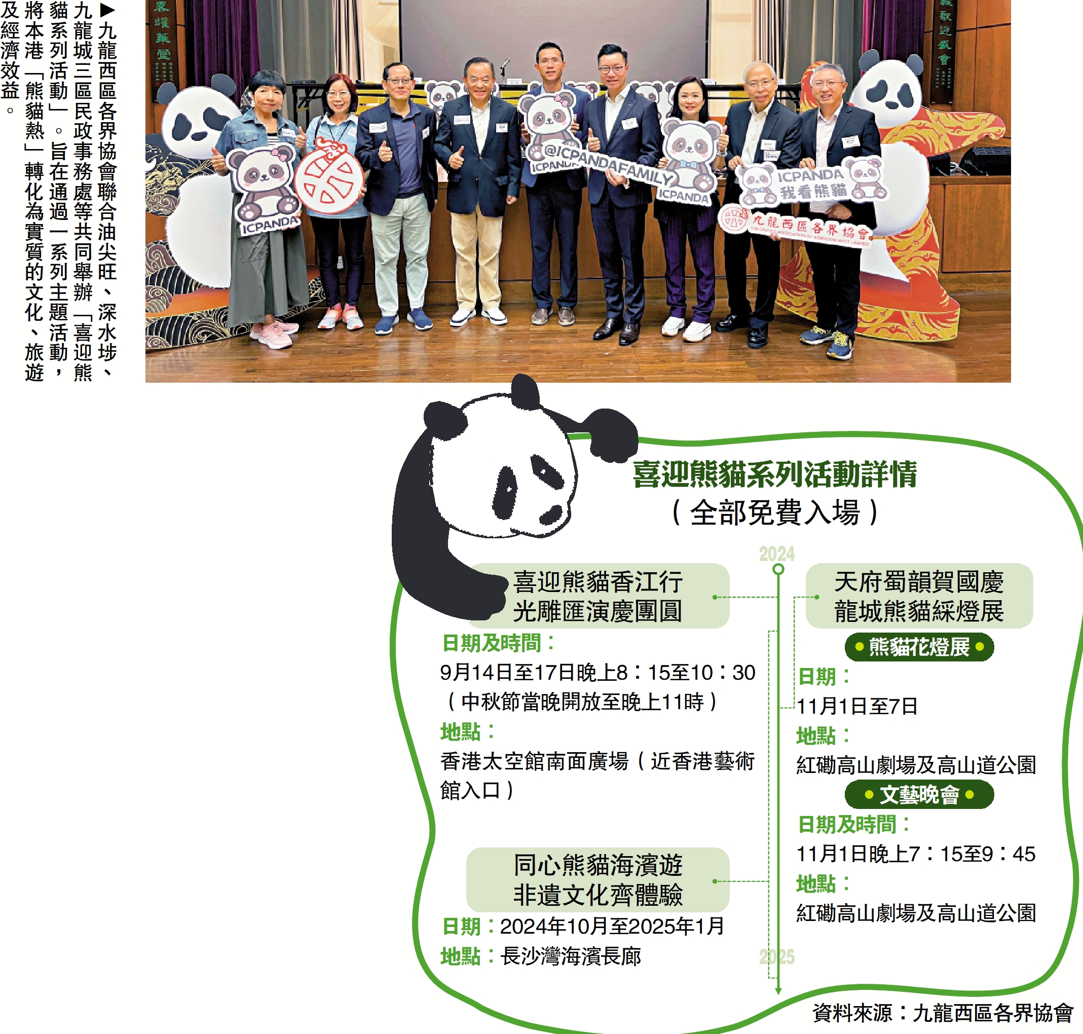 「喜迎熊貓系列活動」由九龍西區各界協會聯合油尖旺、深水埗、九龍城三區民政事務處,以及香港青年聯會、香港四川社團總會、香港成都社團總會及香港海洋公園共同舉辦,旨在通過一系列以熊貓和川港文化為主題的活動,將本港「熊貓熱」轉化為實質的文化、旅遊及經濟效益。活動為期六個月,全部免費入場。