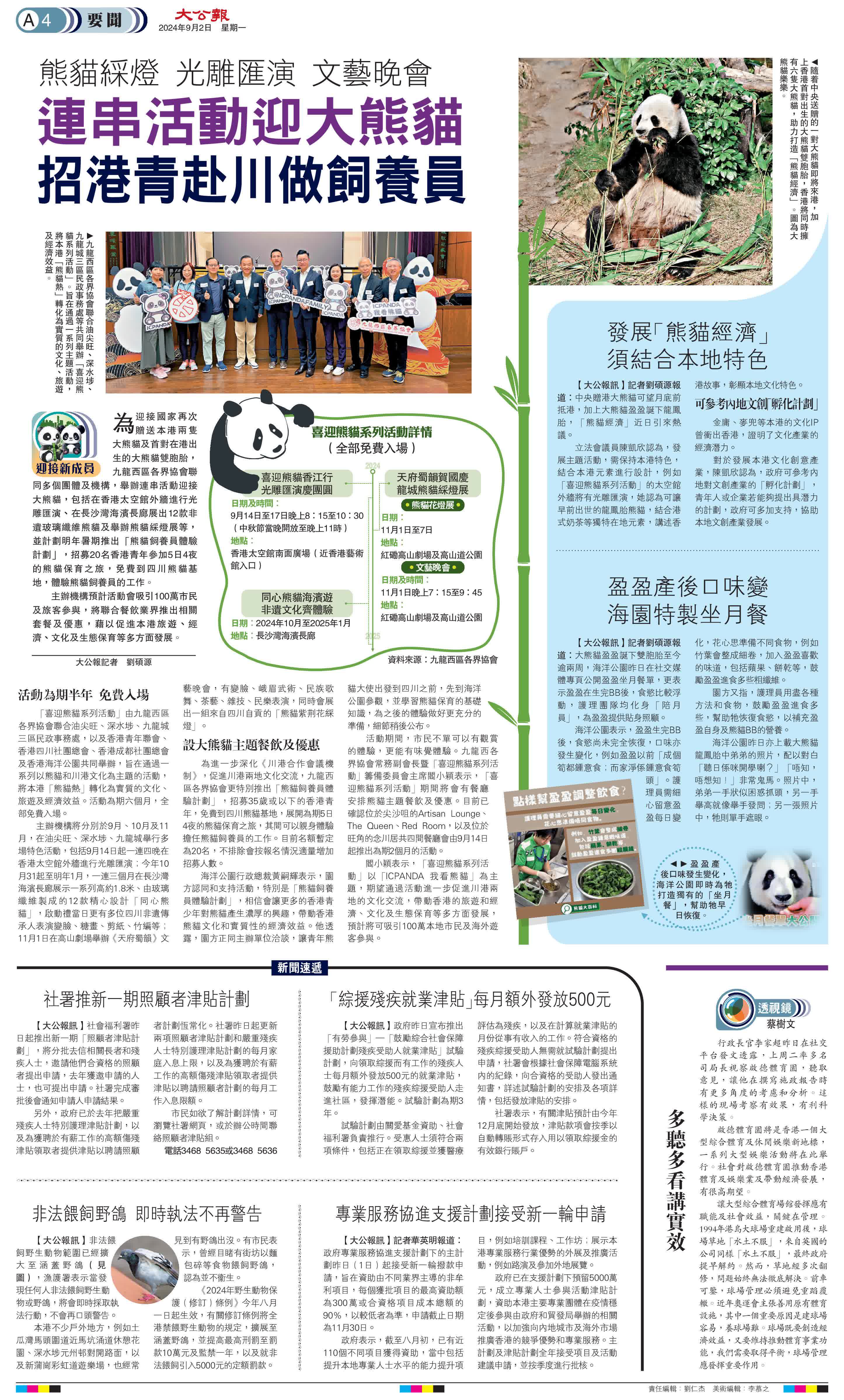 (大公報記者 劉碩源)為迎接國家再次贈送本港兩隻大熊貓及首對在港出生的大熊貓雙胞胎,九龍西區各界協會聯同多個團體及機構,舉辦連串活動迎接大熊貓,包括在香港太空館外牆進行光雕匯演、在長沙灣海濱長廊展出12款非遺玻璃纖維熊貓及舉辦熊貓綵燈展等,並計劃明年暑期推出「熊貓飼養員體驗計劃」,招募20名香港青年參加5日4夜的熊貓保育之旅,免費到四川熊貓基地,體驗熊貓飼養員的工作。