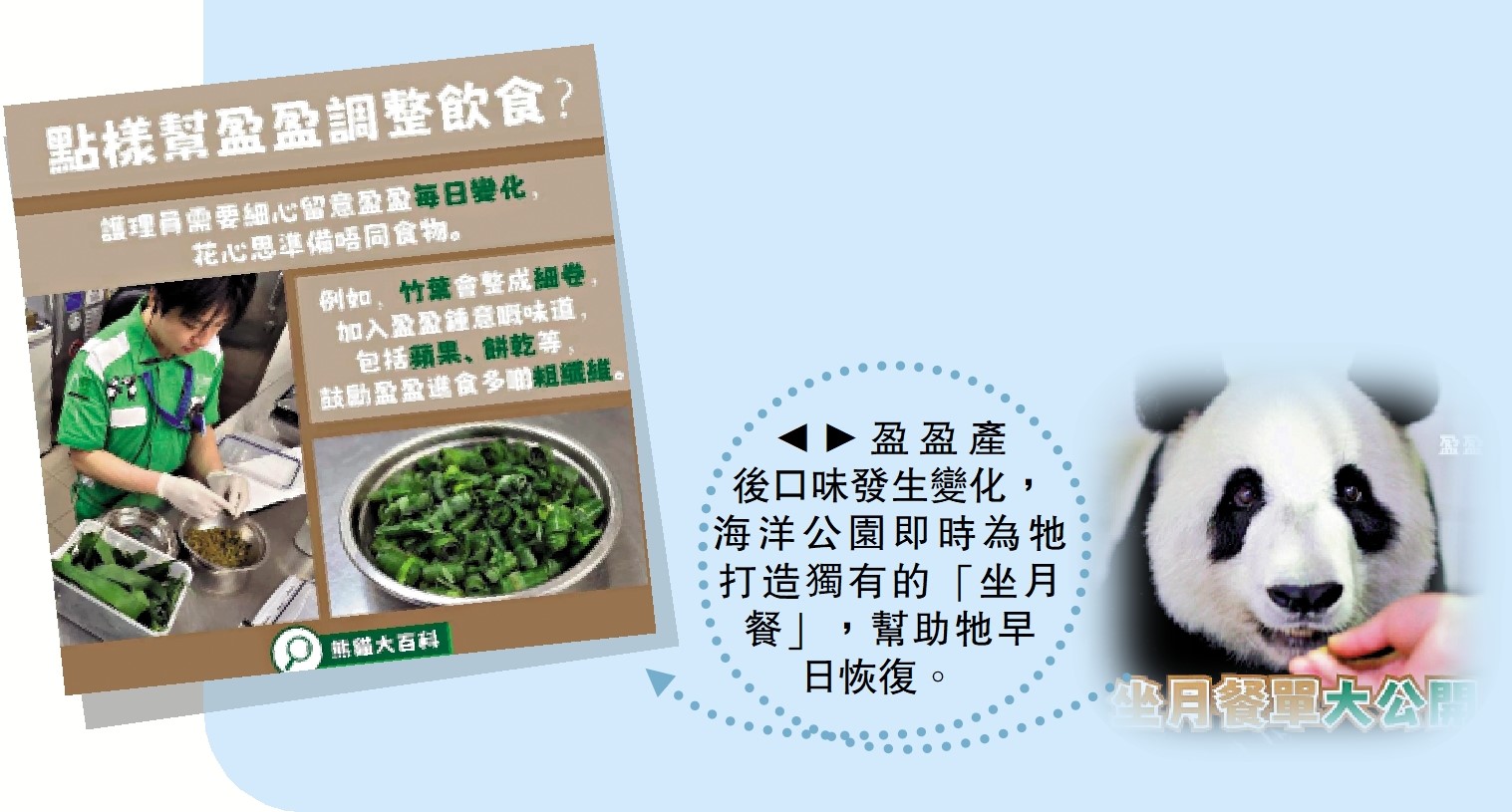 大熊貓盈盈誕下雙胞胎至今逾兩周,海洋公園昨日在社交媒體專頁公開盈盈坐月餐單,更表示盈盈在生完BB後,食慾比較浮動,護理團隊均化身「陪月員」,為盈盈提供貼身照顧。