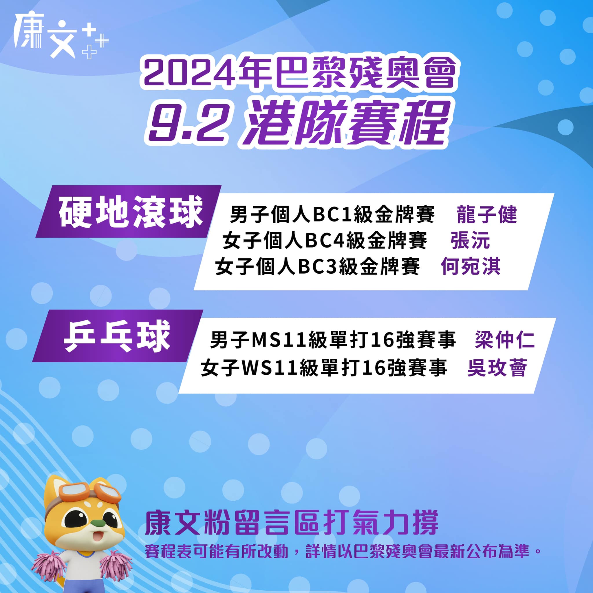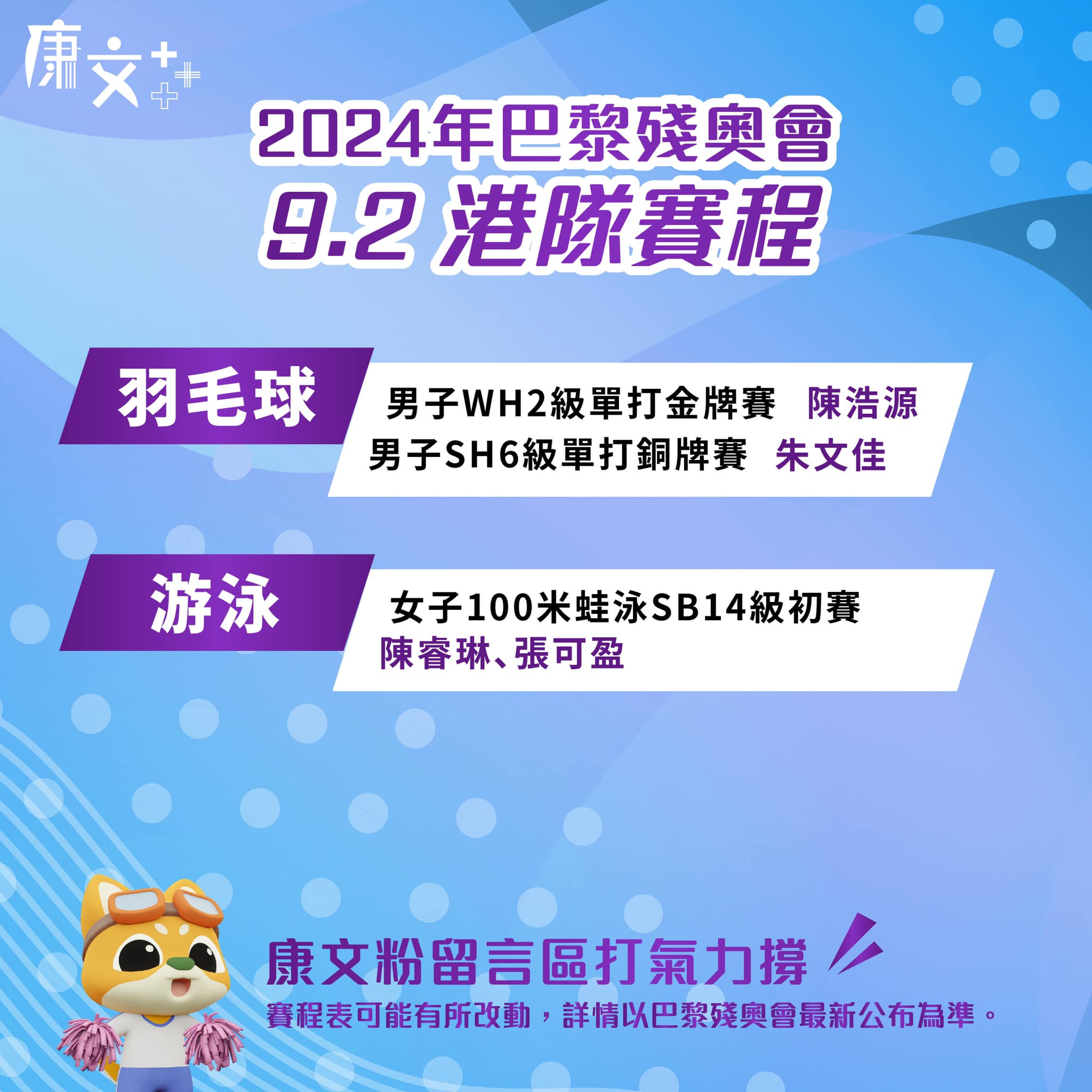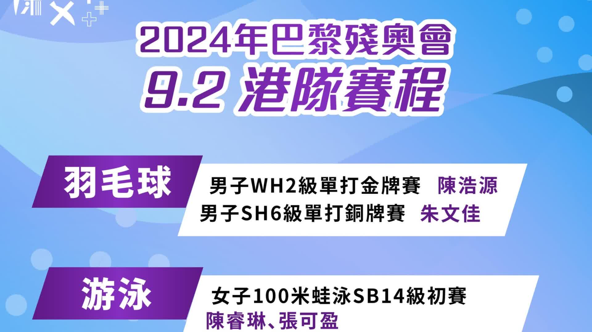 大公文匯全媒體報道,巴黎殘奧會精彩不斷,港將繼續出擊多項賽事,奮力為港爭光!今日(2日)多名港將會出戰金牌賽事,坐銀望金,港隊將有至少4面獎牌進賬。