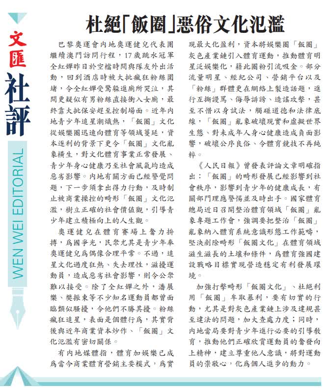 巴黎奧運會內地奧運健兒代表團繼續澳門訪問行程,17歲跳水冠軍全紅嬋昨日於空檔時間與隊友外出活動,回到酒店時被大批瘋狂粉絲圍堵,令全紅嬋受驚躲進廁所哭泣,其間更疑似有男粉絲直接衝入女廁,最終靠大批保安趕至控制場面。近年內地青少年追星潮熾熱,「飯圈」文化從娛樂圈迅速向體育等領域蔓延,資本逐利的背景下更令「飯圈」文化亂象橫生,對文化體育事業正常發展、青少年身心健康乃至社會風氣均造成惡劣影響。內地有關方面已經警覺問題,下一步須拿出得力行動,及時制止被商業操控的畸形「飯圈」文化氾濫,樹立正確的社會價值觀,引導青少年建立積極向上的人生觀。