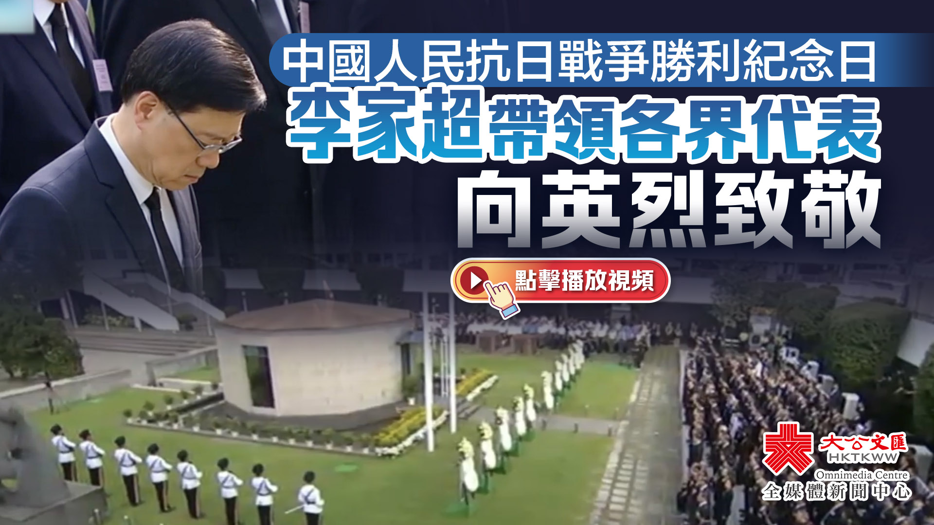 (大公文匯全媒體 記者 鄭洢林)今日(9月3日)是中國人民抗日戰爭勝利紀念日,行政長官李家超、特區政府高層官員、立法會議員、退伍軍人團體、其他界別社會人士、制服團隊及青年團體等代表今早出席在香港大會堂紀念花園舉行的官方儀式。