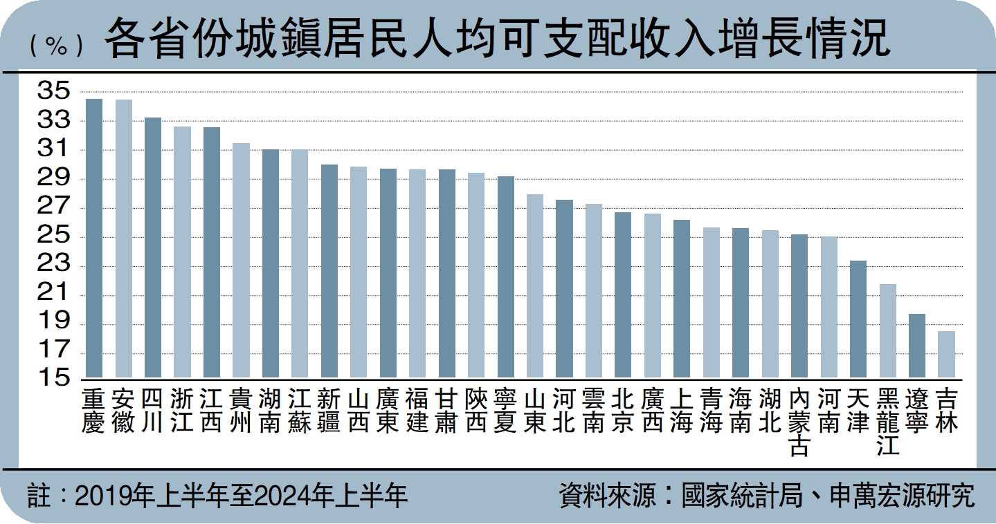 近年來,中西部地區居民收入增長較快,持續性也強於東部地區。考慮人口因素後,2024年上半年,中西部地區的人均可支配收入增速分別錄得5.2%、5.7%,超過東部地區5%的漲幅。拉長時間周期至2019年以來,中西部地區的居民收入漲幅也持續高於東部地區。其中,貴州、四川、安徽等省居民收入增長尤為突出。
