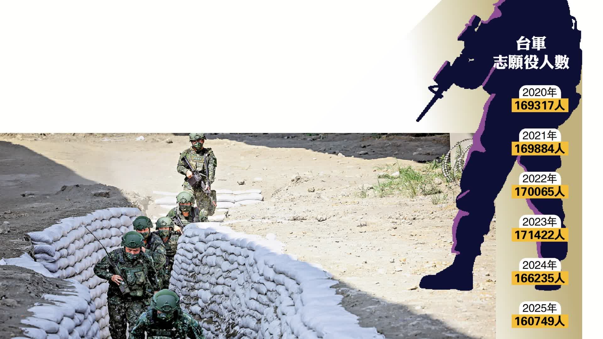 台灣中華戰略前瞻協會研究員揭仲指出,台軍「預算員額」會反映出台防務部門對該年度實際人數的估計,但會比實際人數高。根據歷年預算書,2020年志願役官士兵的「預算員額」為169317人、2021年為169884人、2022年為170065人、2023年則為171422人;但2024年的「預算員額」卻降為166235人,比2023年驟減5187人,2025年比2024年又減少5486人,僅為160749人,是2020年以來新低。