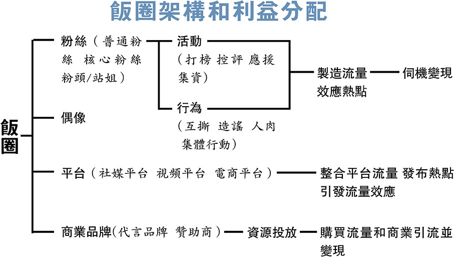 據香港文匯報記者多方了解,經過將近10年的不斷發展,曾經純粹的體壇,正逐步構建起複雜而精細的飯圈生態架構。在較為傳統的飯圈框架下,一共分為品牌商、媒體平台、粉絲和偶像四大部分。其中品牌商以代言品牌和贊助商為主,主要負責資源投放,而在社交媒體唯流量論的當下,通過簽約具有話題性的目標運動員,並在後續操作中,標定偶像向平台流量進行資源傾斜,實現商業引流和變現,是快銷商業品牌較為喜歡使用的手法;平台方面,則熱衷於通過技術手段實現流量傾斜(見特稿)。而若要實現相關目標,粉絲渠道是必不可少的環節和路徑,其作用在於,通過網絡平台製造有流量效應的熱點,以供上游渠道實現增加曝光度和引流整合及變現目的。而位於粉絲圈層頭部的網紅或工作室也可以藉此分得一杯羹。
