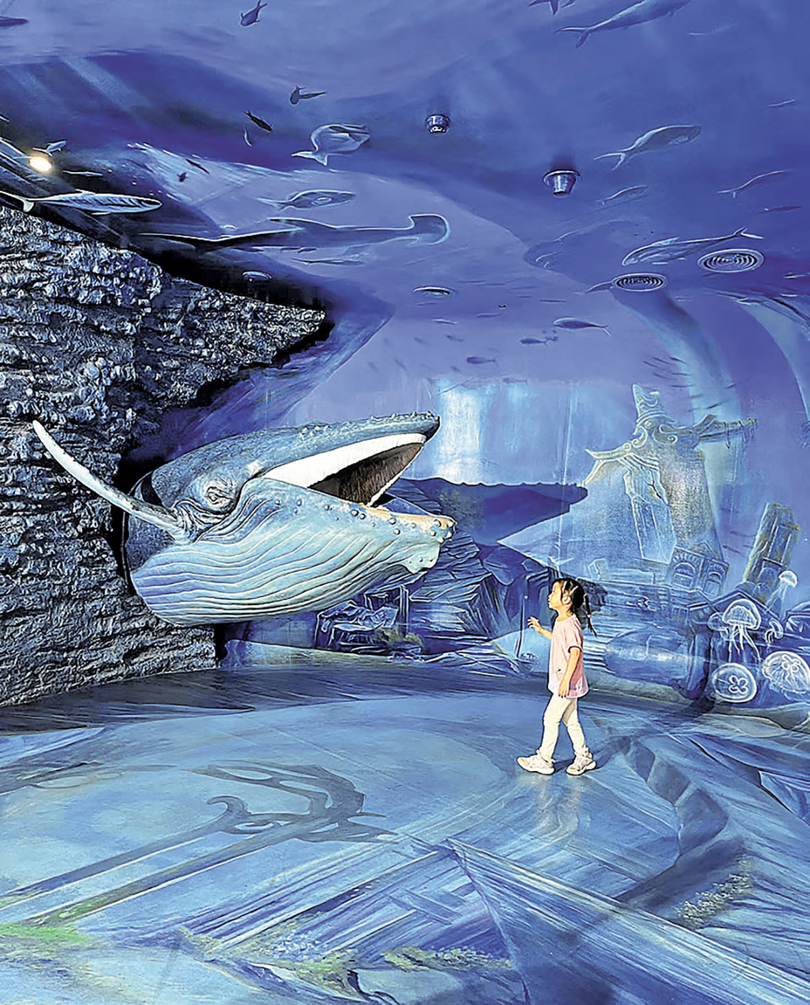 突破傳統海洋館的常規設計理念,根據場地空間特徵規劃選材,充分考慮遊客參觀模式,採用獨特的深海沉浸式體驗設計理念,以豐富的展示手段,生動的景觀設計,再現海底的美麗與神奇。當中有AR互動區讓遊客一進館,就感受到潛入深海的氣息,猶如穿越到藍色大海裏,與魚兒作伴,與水母交友,如夢如幻。