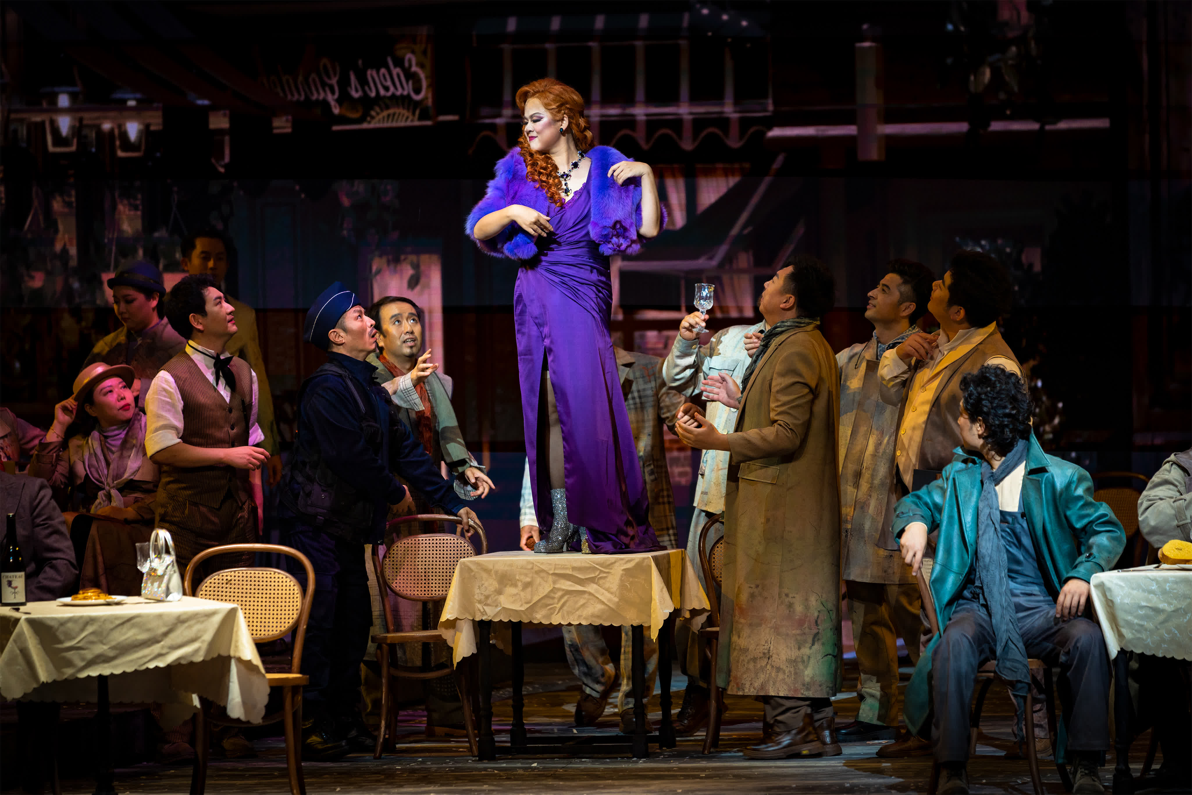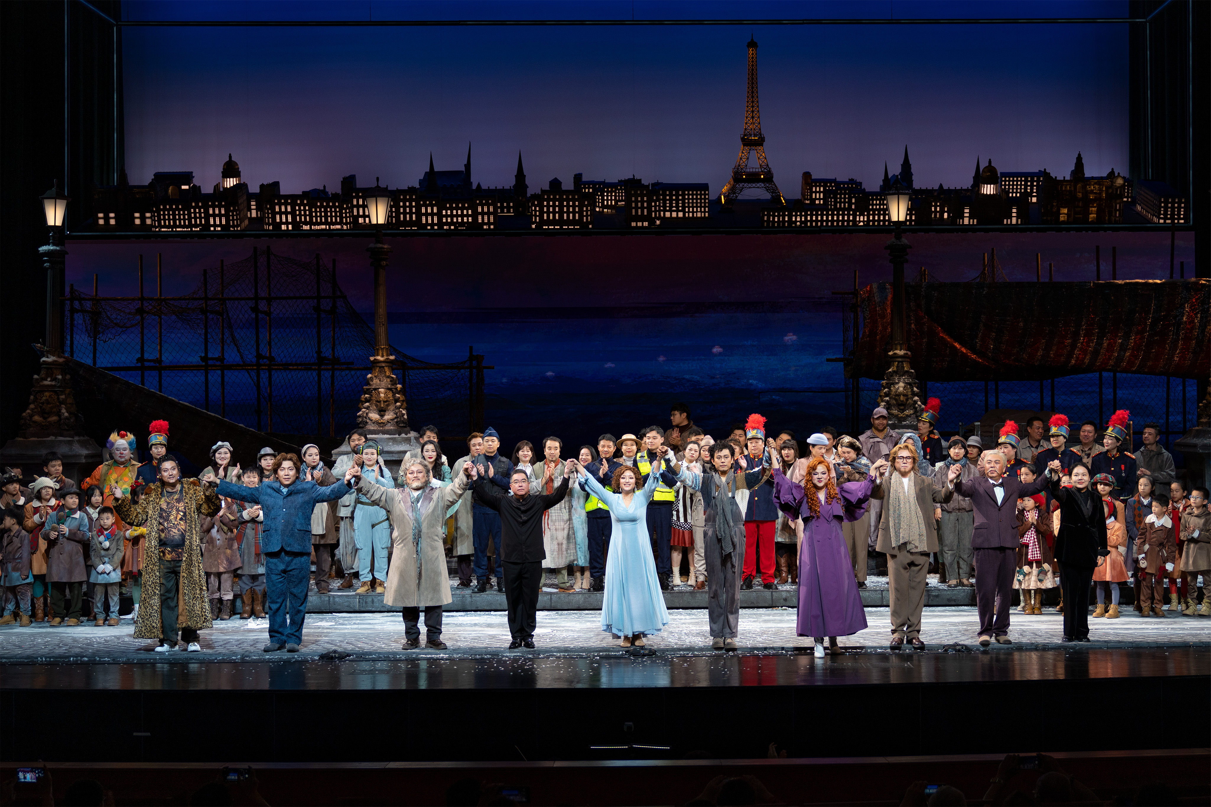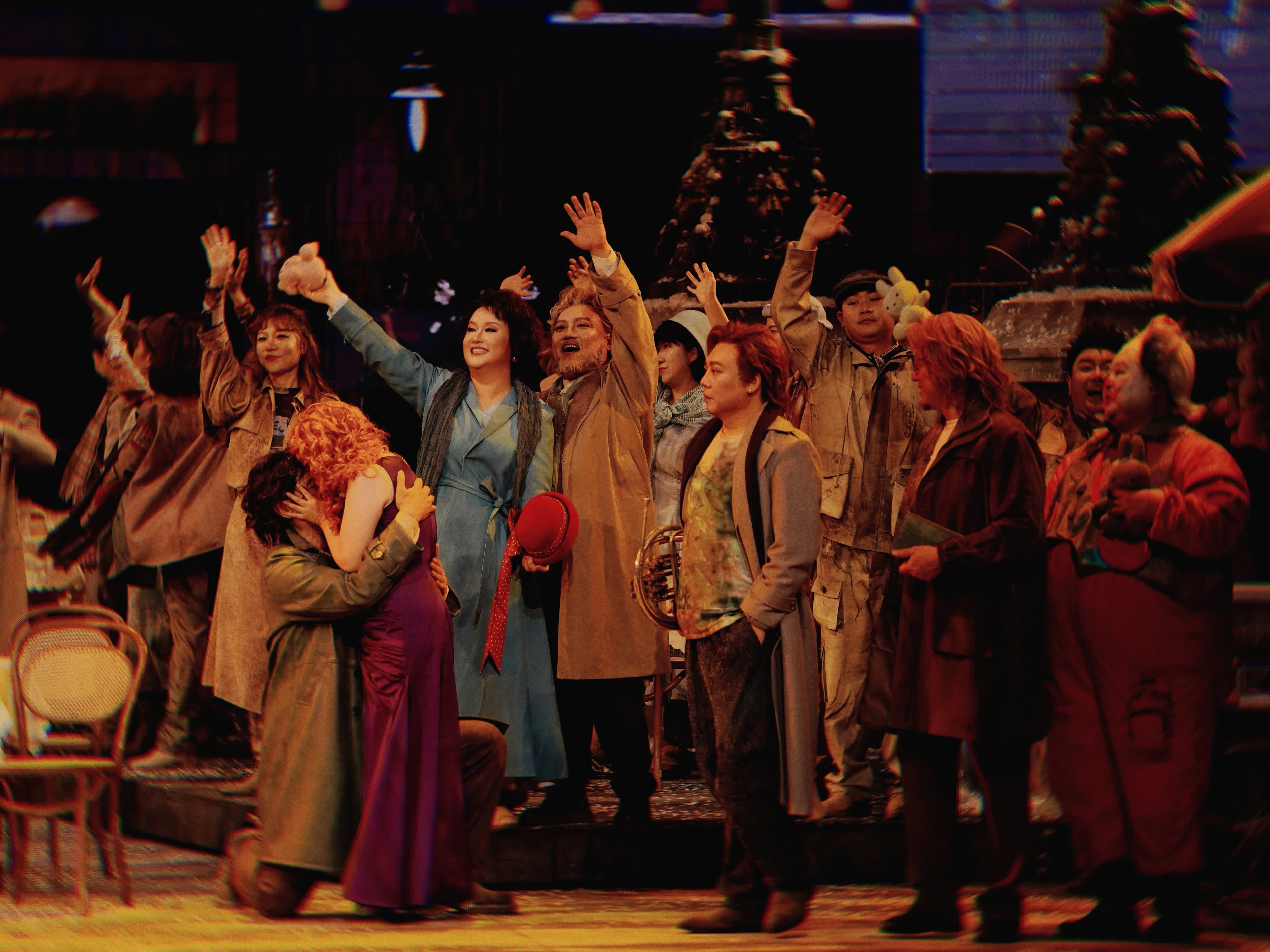 今次新版《藝術家生涯》在保留原作精髓的基礎上,進行了大膽的創新與突破。從魯道夫的主觀視角凝望,倒敘的呈現和時空的穿梭讓作品在真實主義之外,多了一層超現實主義的色彩。舞台設計更是別出心裁,將場景移至巴黎塞納河上的新橋,通過橋樑與河流的巧妙組合,象徵着時間的流逝與溝通的渴望,同時也映射出人物內心的波瀾與轉折。舞台上方懸掛的微縮巴黎景觀「盒子」,更是將時空的跳轉與情感的起伏融為一體,讓觀眾在視覺與心靈的雙重震撼中,感受藝術的無限魅力。