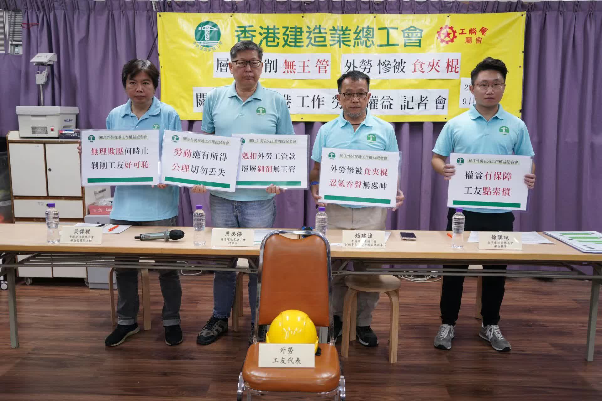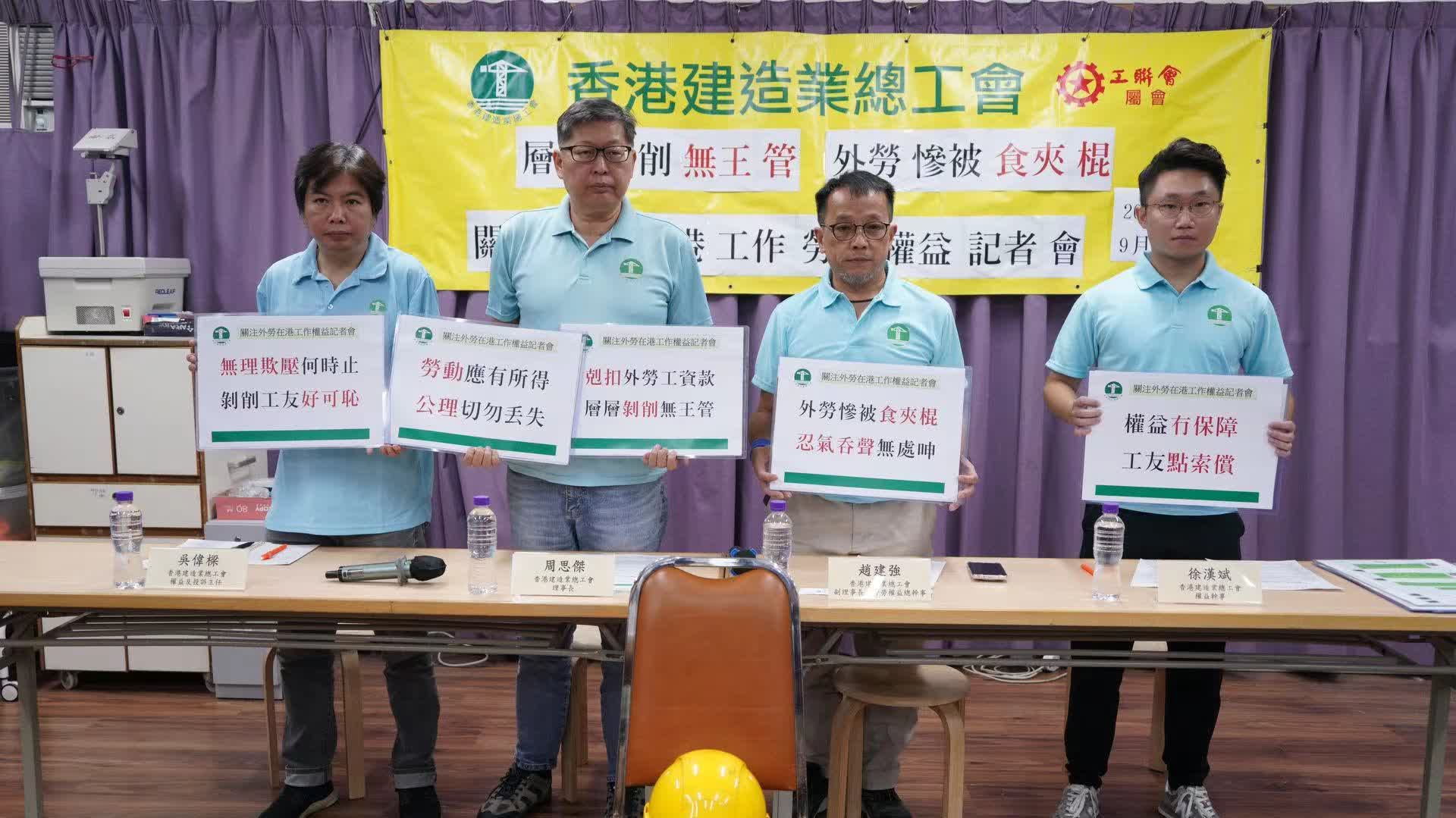 (大公文匯全媒體 記者 李九歌)香港建造業總工會「外勞權益關注組」(關注組)近月收到多名外勞的投訴,稱自己及身邊的工友被外勞管理公司層層剝削,今日(4日)舉行記者會。香港建造業總工會理事長周思傑,香港建造業總工會副理事長、外勞權益總幹事趙建強,香港建造業總工會權益及投訴主任吳偉樑,香港建造業總工會權益幹事徐漢斌及工友代表出席。