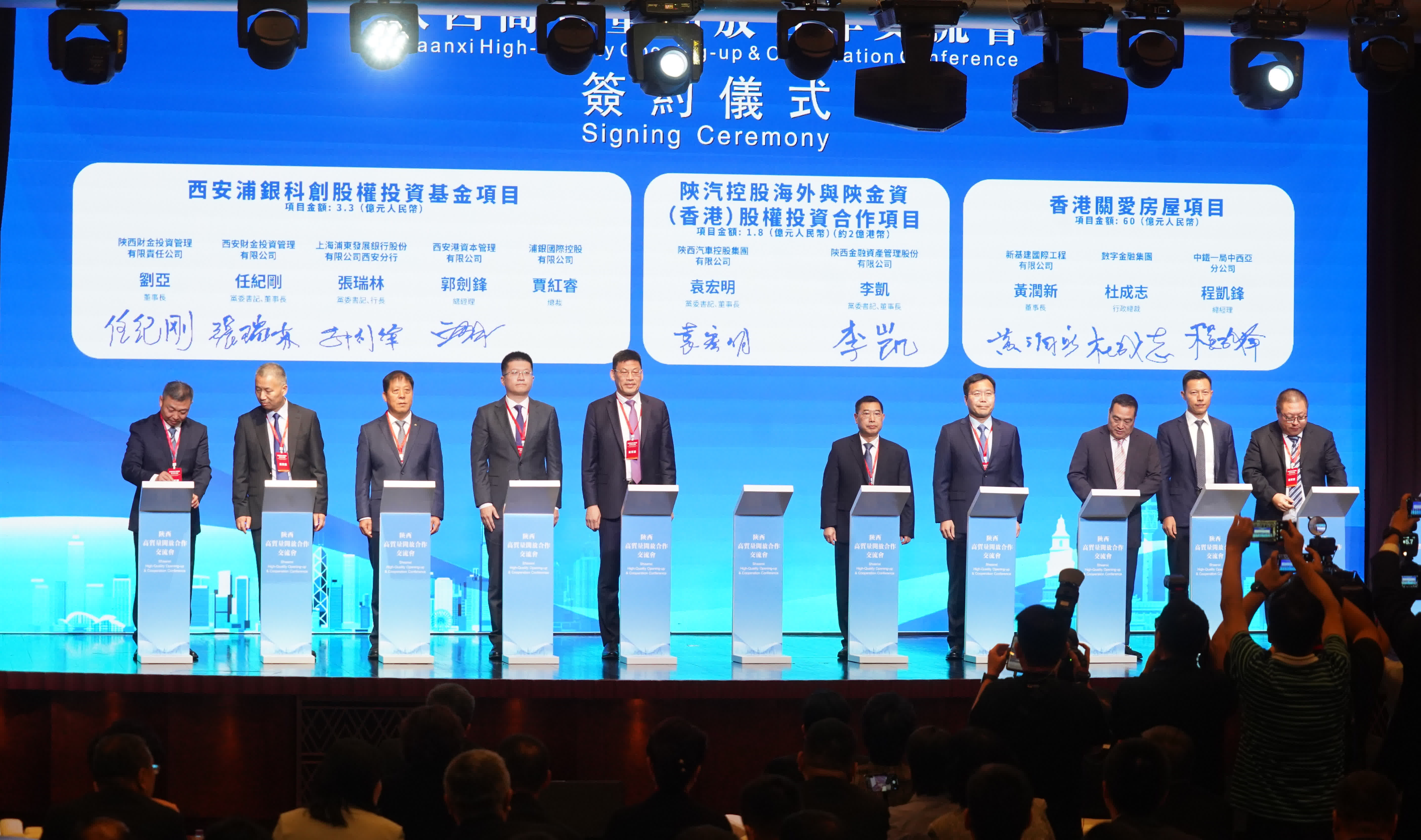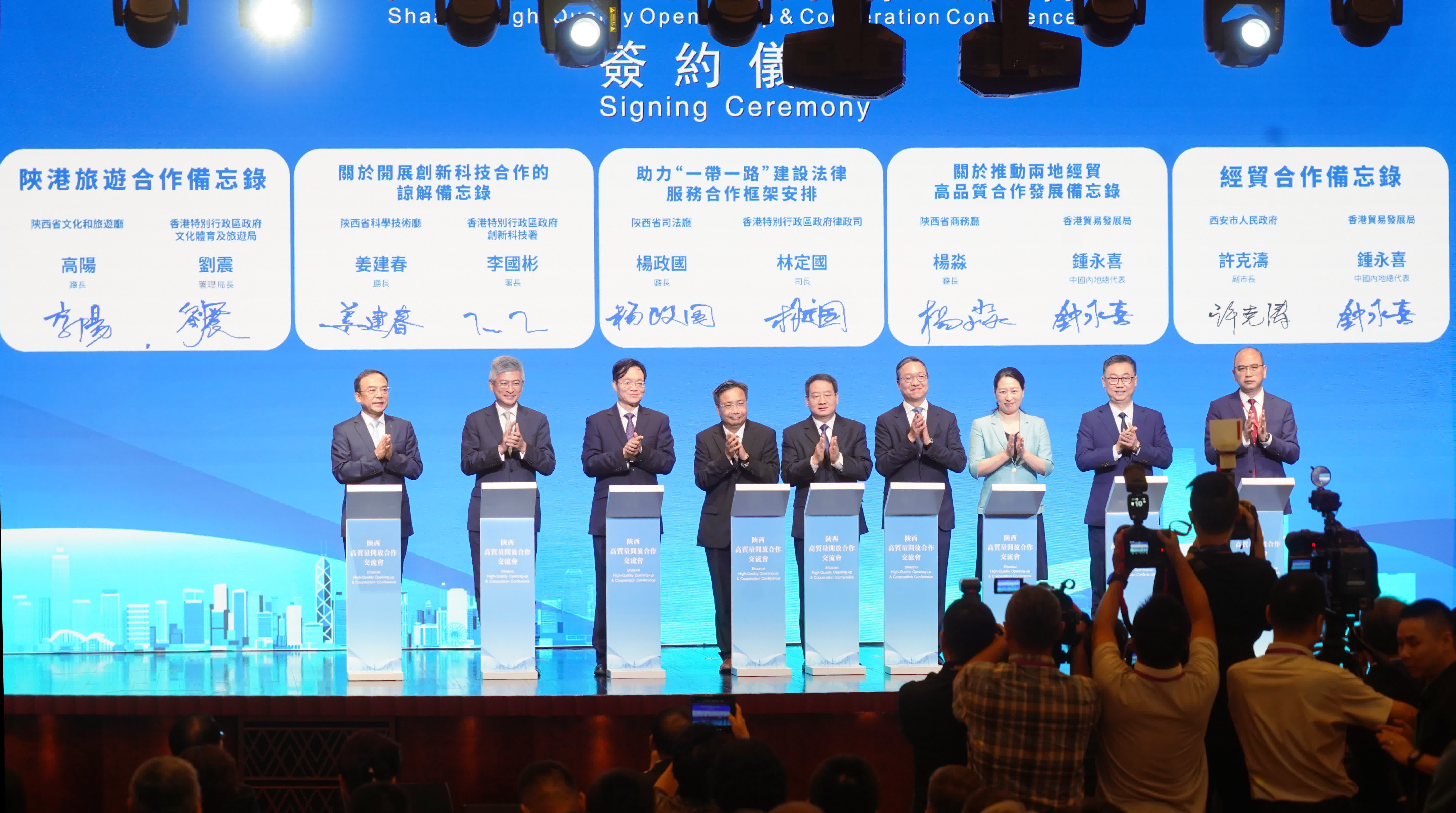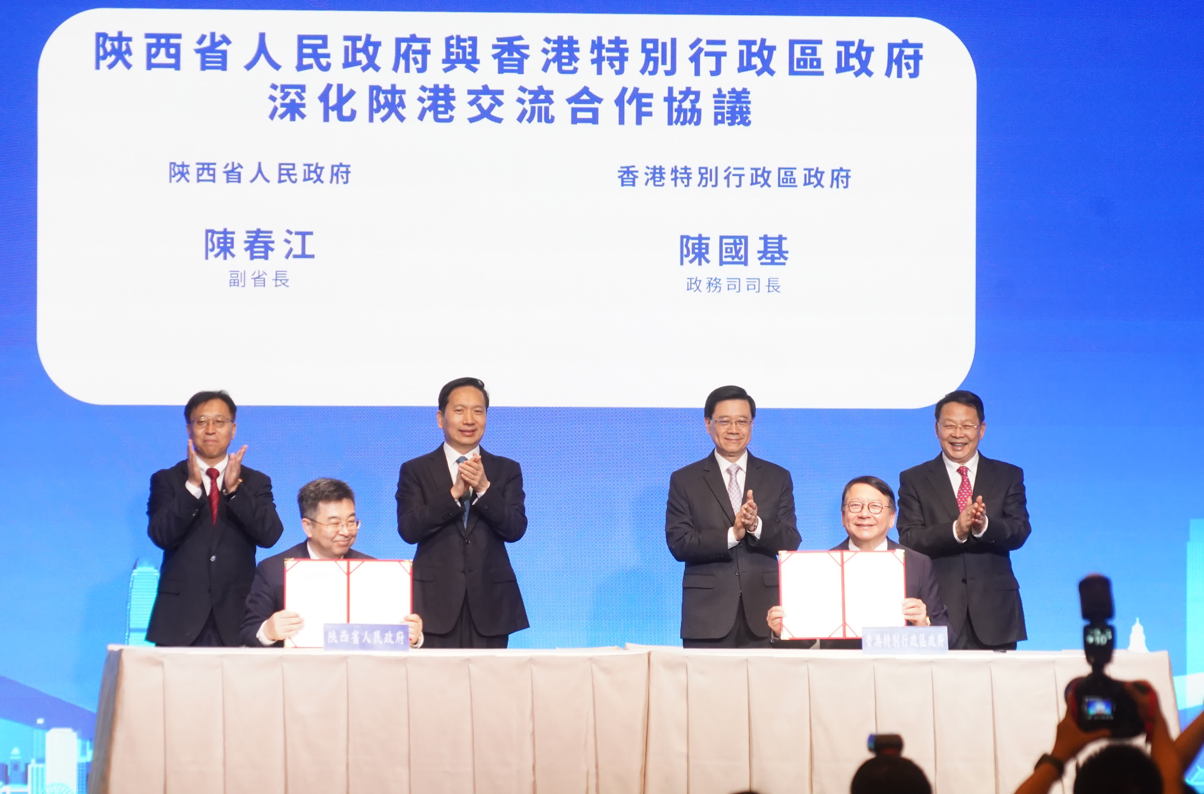 在李家超和趙一德見證下,陳國基和陝西省副省長陳春江簽署深化合作協議;林定國、署理文化體育及旅遊局局長劉震、創新科技署署長李國彬、貿發局內地總代表鍾永喜亦分別與陝西有關部門簽署旅遊、創新科技、法律服務、經貿合作有關的備忘錄和安排。其中,特區政府律政司與陝西省司法廳簽署《助力「一帶一路」建設法律服務合作框架安排》,深化兩地法律服務和人才培養交流合作,更好推動兩地法律服務機構為「一帶一路」高質量發展、國家企業和公民「走出去」提供優質高效的法律服務。