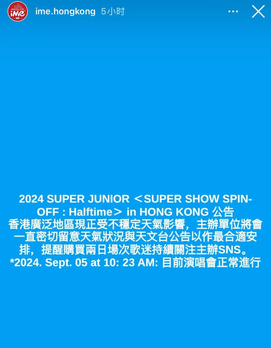 韓國天團SUPER JUNIOR(SJ)原定明日(6日)起一連兩晚在亞洲國際博覽館舉行《2024 SUPER JUNIOR ASIA TOUR》,今日主辦單位IME HK在社交平台宣布目前演唱會正常進行,並表示,香港廣泛地區現正受不穩定天氣影響,主辦單位將會一直密切留意天氣狀況與天文台公告以作最合適安排,提醒購買兩日場次歌迷持續關注主辦SNS。