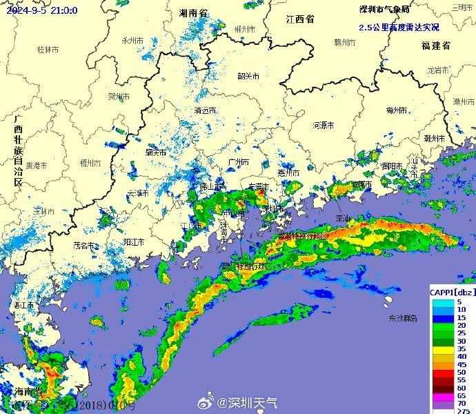 預計深圳全市3小時內將出現強降水,深圳市氣象台9月05日21時10分在全市發布暴雨黃色預警信號,後期有升級暴雨橙色預警信號的可能,全市進入暴雨戒備狀態,存在山洪風險,氣象局提醒注意防禦暴雨可能引發的局部內澇、山洪等災害。