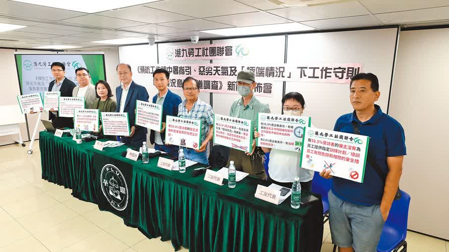 勞聯今年7月至8月就《預防工作時中暑指引》及《惡劣天氣及「極端情況」下工作守則》的實際執行情況,訪問642名工友。結果顯示, 57.5%受訪者在惡劣天氣及極端情況下需要返工,涉及公共運輸、物業維修、保安、清潔、醫院、機場、護老院及飲食業等從業員。 33.3%受訪者的僱主會額外發放當值津貼及往返工作地點的特別交通津貼,32.5%僱主會發放高於正常工資的津貼,僅30.1%僱主有安排接送服務。