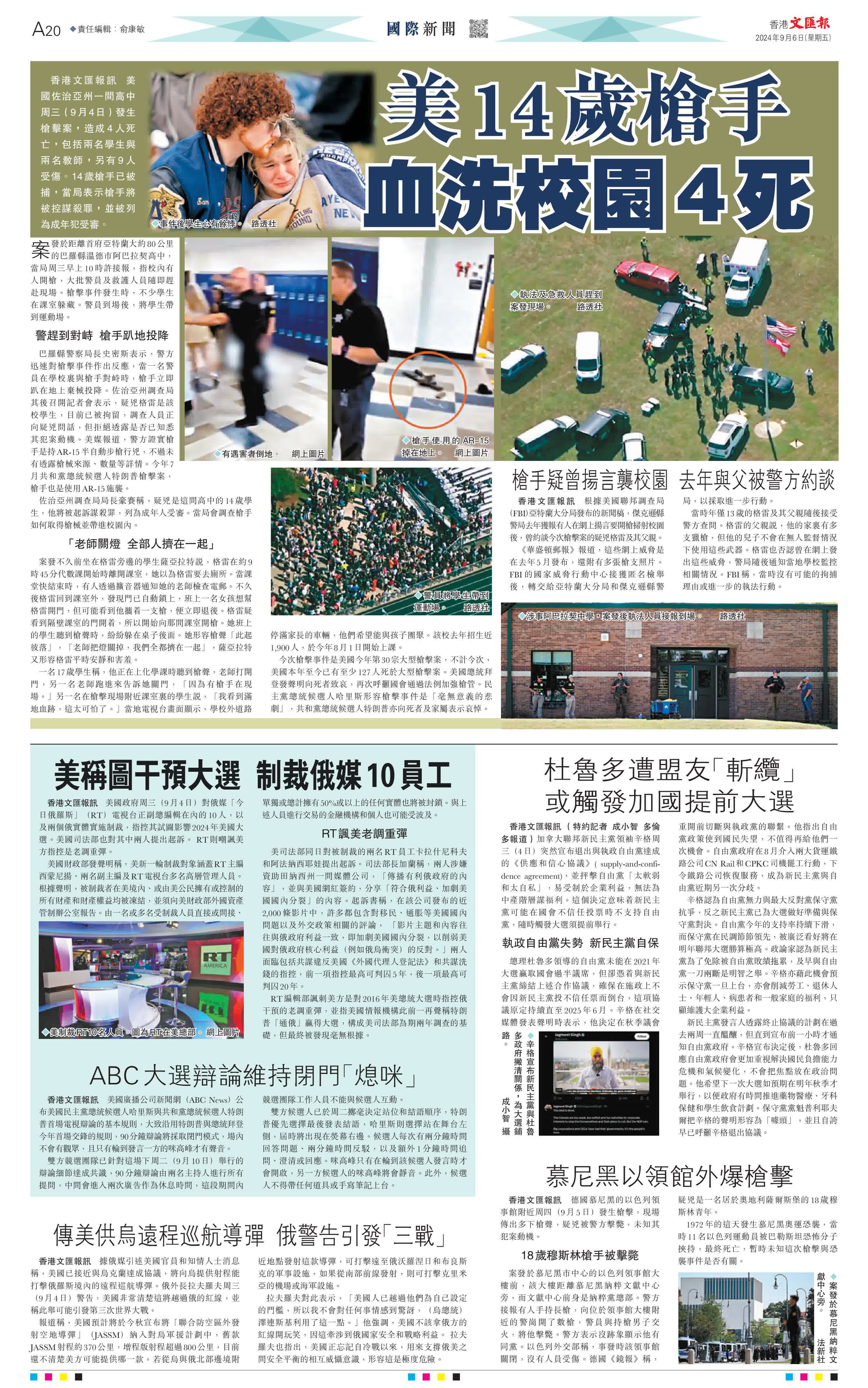 香港文匯報綜合報道,美國佐治亞州一間高中周三(9月4日)發生槍擊案,造成4人死亡,包括兩名學生與兩名教師,另有9人受傷。14歲槍手已被捕,當局表示槍手將被控謀殺罪,並被列為成年犯受審。