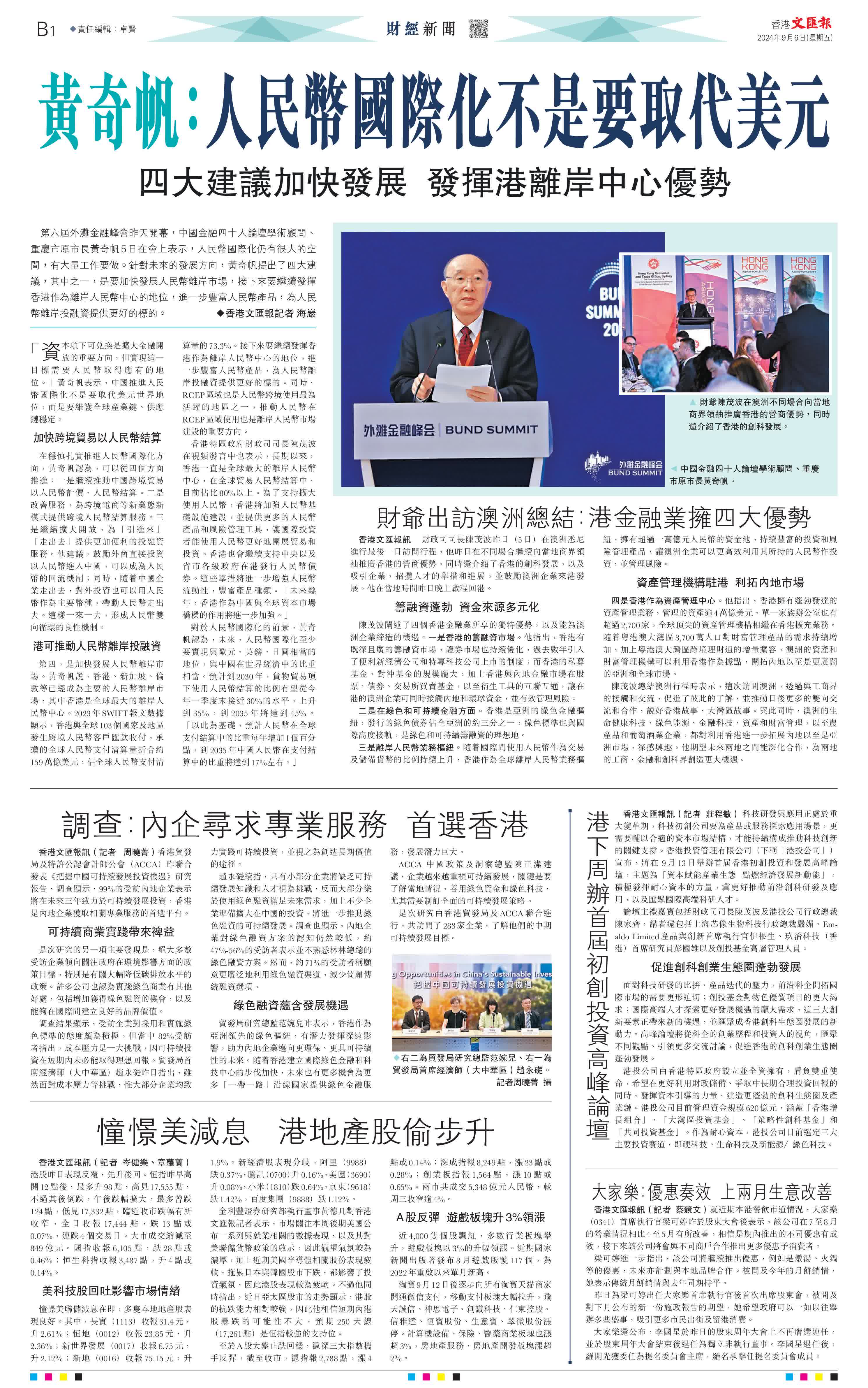 香港特區政府財政司司長陳茂波在視頻發言中也表示,長期以來,香港一直是全球最大的離岸人民幣中心,在全球貿易人民幣結算中,目前佔比80%以上。為了支持擴大使用人民幣,香港將加強人民幣基礎設施建設,並提供更多的人民幣產品和風險管理工具,讓國際投資者能使用人民幣更好地開展貿易和投資。香港也會繼續支持中央以及省市各級政府在港發行人民幣債券。這些舉措將進一步增強人民幣流動性,豐富產品種類。「未來幾年,香港作為中國與全球資本市場橋樑的作用將進一步加強。」