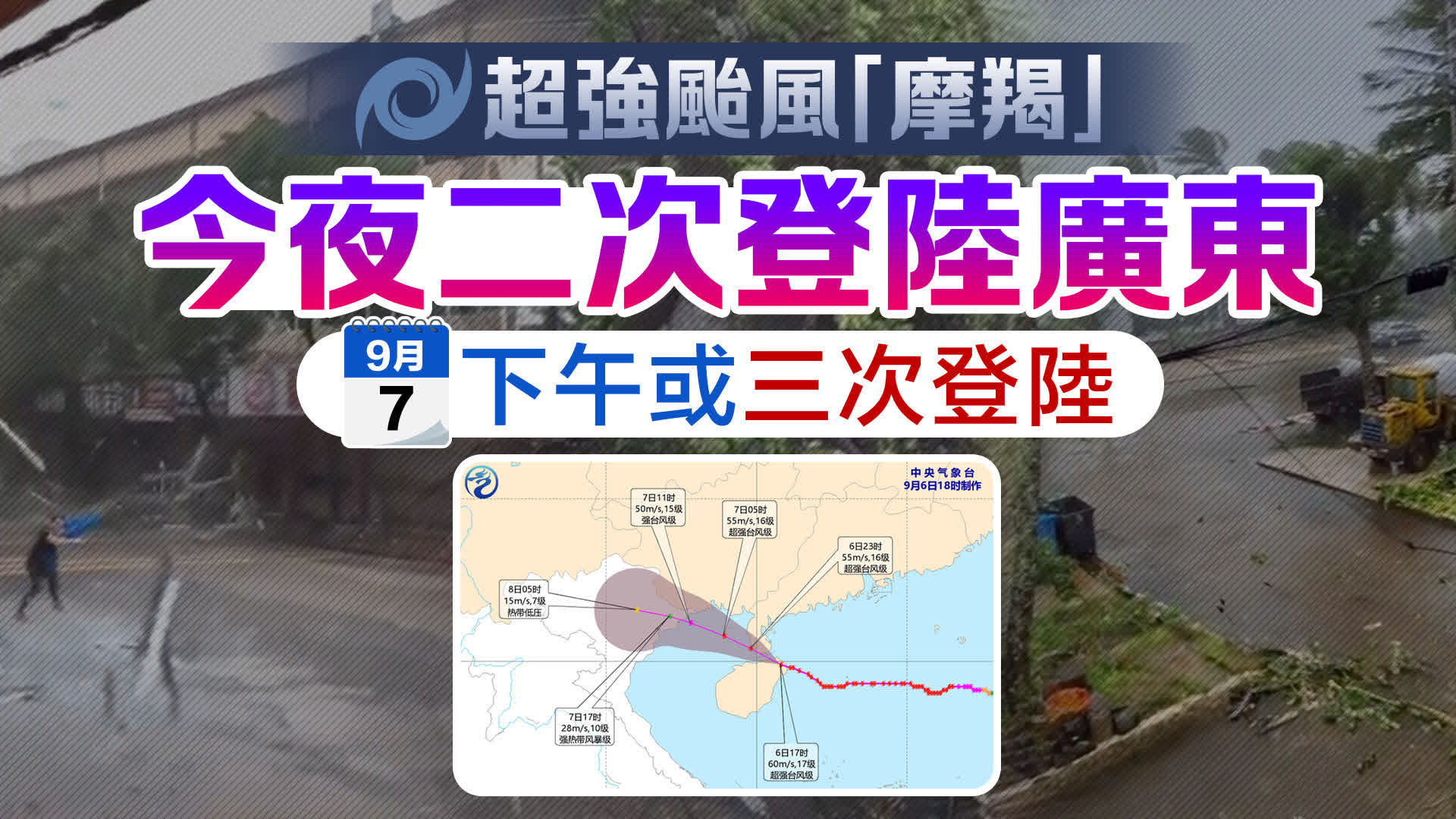 據廣東省氣象局消息,颱風「摩羯」已於今日22時20分前後以超強颱風級在湛江市徐聞縣角尾鄉沿海再次登陸,登陸時中心附近最大風力17級(58米/秒),中心最低氣壓925百帕。預計,「摩羯」將以15-20公里的時速繼續向西偏北方向移動,隨後進入北部灣,強度有所減弱,將於7日下午前後在中越交界一帶再次登陸(颱風級或強颱風級,13-14級),之後強度快速減弱。