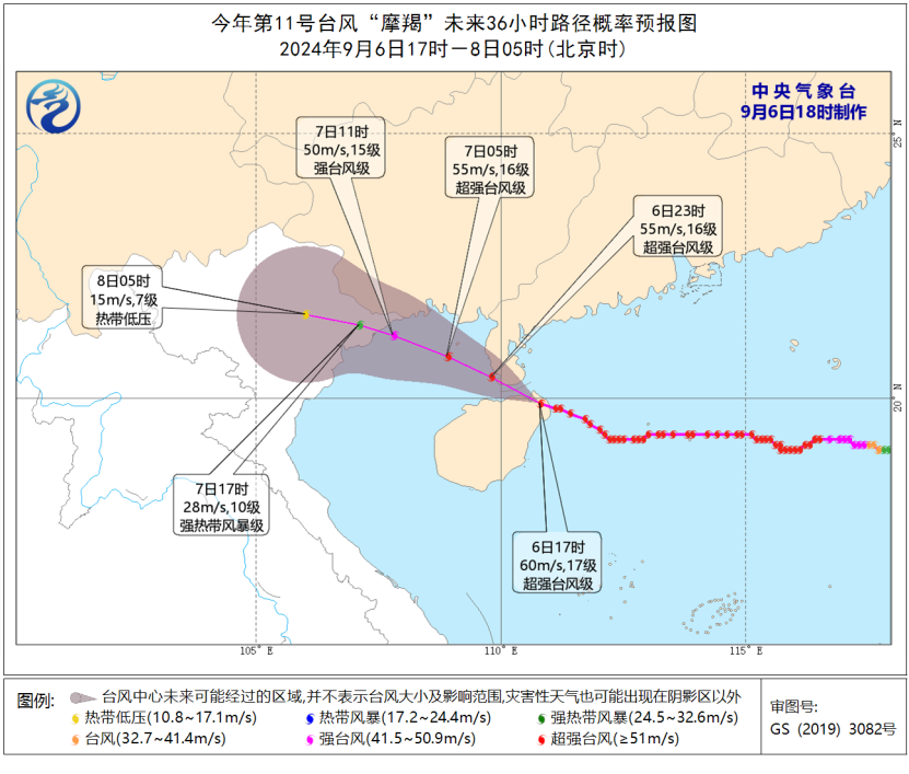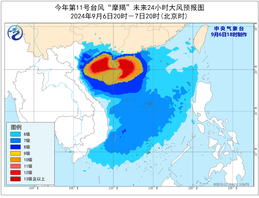 9月6日20時至7日20時,南海大部、廣東中西部沿海、廣西南部將有6-8級大風,南海西部的部分海域、北部灣、瓊州海峽、廣東西部沿海、廣西沿海、海南島及其沿海將有9-12級大風,「摩羯」中心經過的附近海域或地區風力可達13-17級。