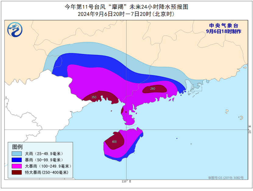 此外,9月6日20時至7日20時,廣西中南部、廣東西南部、海南島、雲南東南部等地有大到暴雨,部分地區有大暴雨。其中,廣西南部沿海、廣東西南部、海南島西部等地局地有特大暴雨(250~400毫米)。