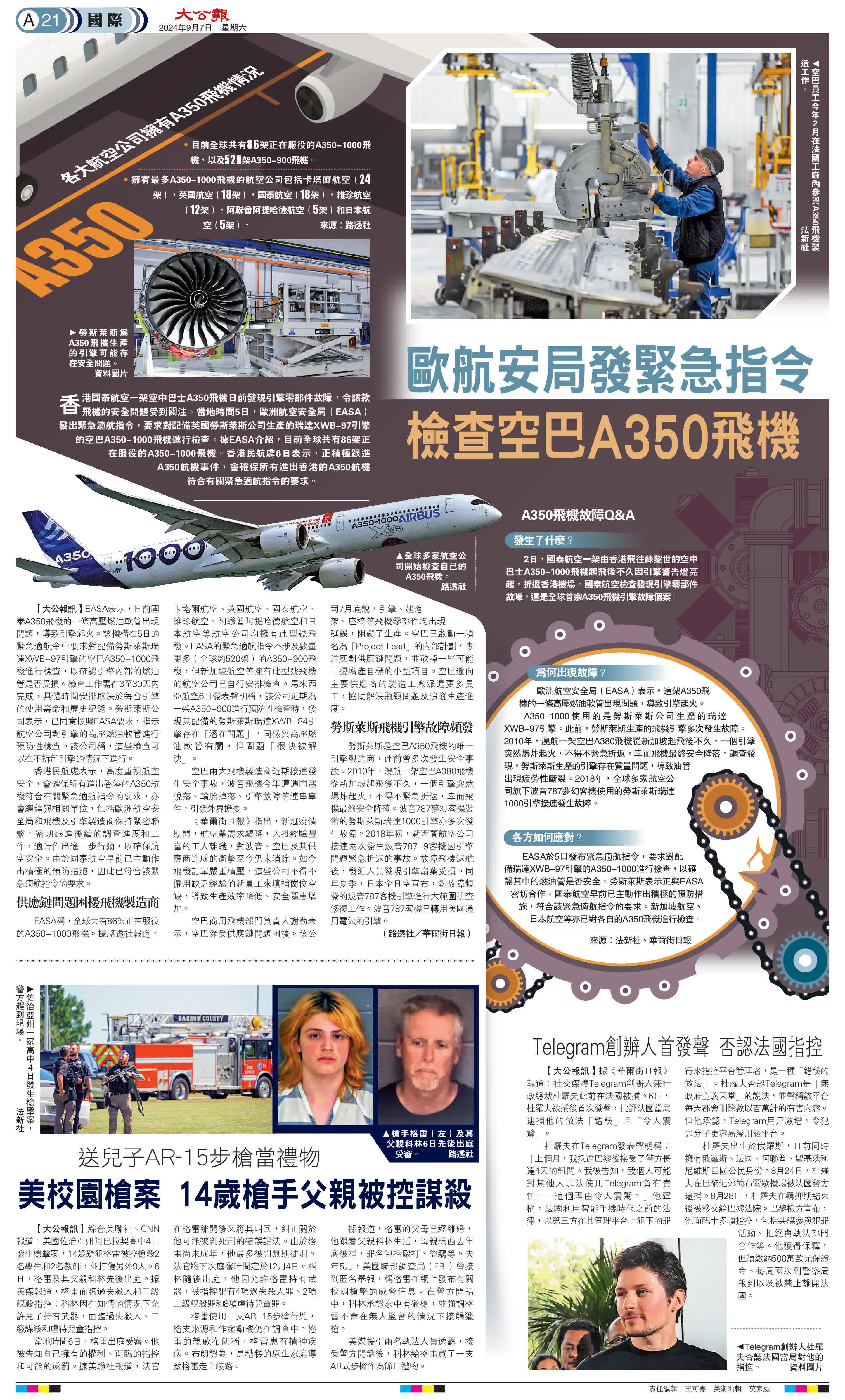 大公報綜合路透社、華爾街日報報道,香港國泰航空一架空中巴士A350飛機日前發現引擎零部件故障,令該款飛機的安全問題受到關注。當地時間5日,歐洲航空安全局(EASA)發出緊急適航指令,要求對配備英國勞斯萊斯公司生產的瑞達XWB-97引擎的空巴A350-1000飛機進行檢查。據EASA介紹,目前全球共有86架正在服役的A350-1000飛機。香港民航處6日表示,正積極跟進A350航機事件,會確保所有進出香港的A350航機符合有關緊急適航指令的要求。
