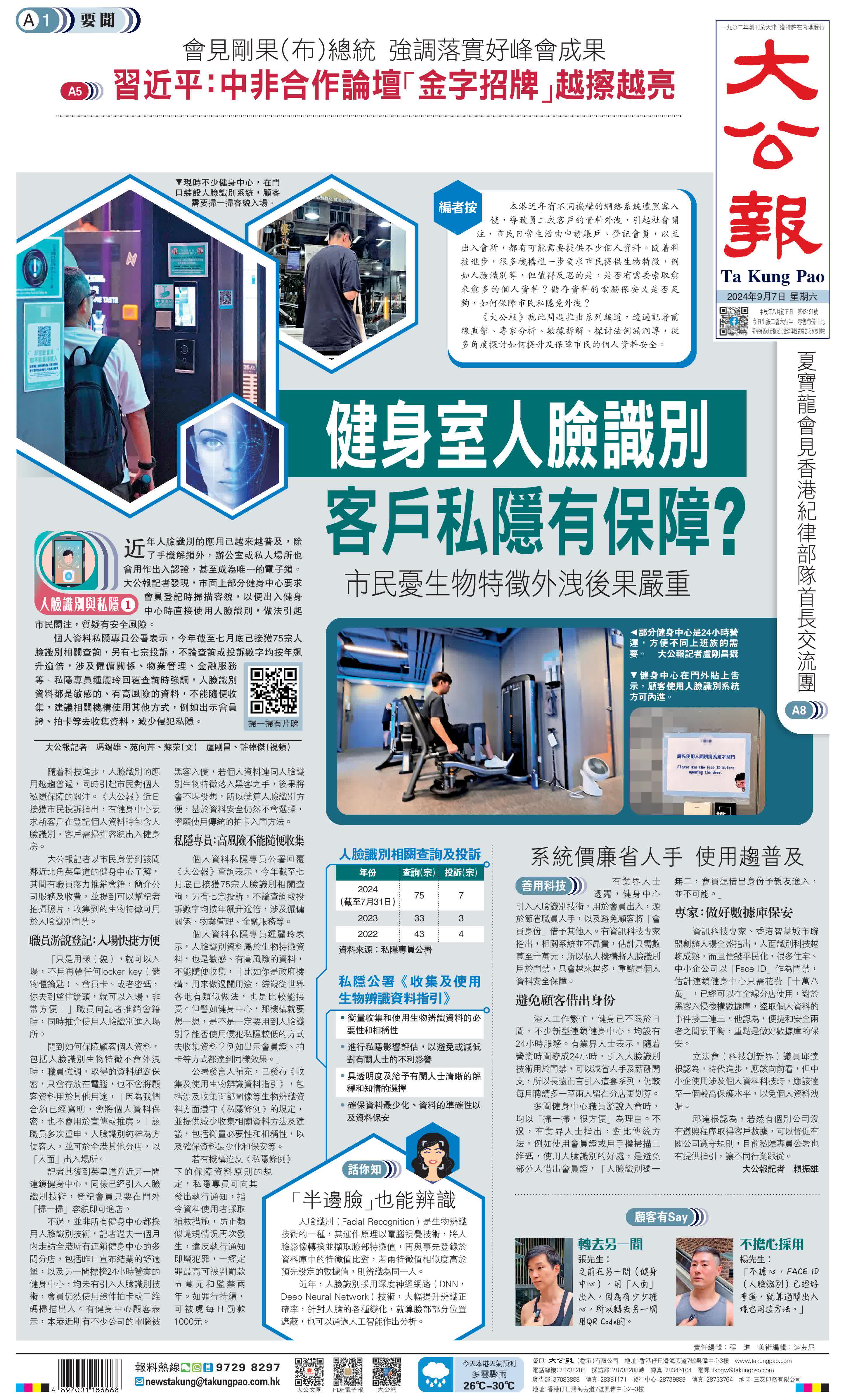 個人資料私隱專員公署回覆《大公報》查詢表示,今年截至七月底已接獲75宗人臉識別相關查詢,另有七宗投訴,不論查詢或投訴數字均按年飆升逾倍,涉及僱傭關係、物業管理、金融服務等。